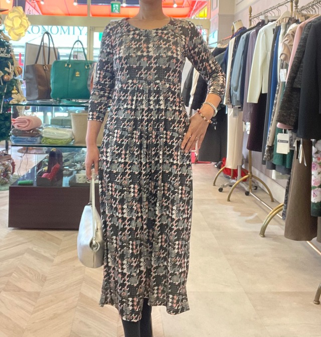 華やか千鳥柄ワンピース フランス製 ストレッチ素材