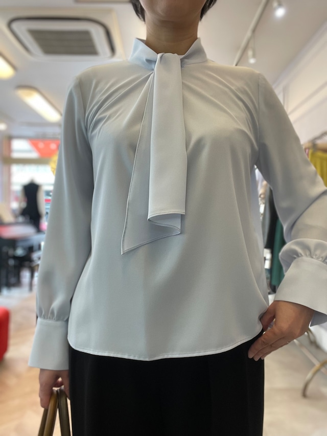 光沢感のあるブラウス 甘さ控えめボウタイ風 ブルー お仕事 お出かけ