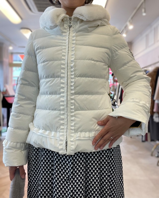 冬の白。ショート丈ダウンコート カジュアルな印象のダウンジャケットですが 清潔感のあるホワイトカラーで上品に 大人のきれいめコーデに きれいめにも、カジュアルにも着ていただけます フードのファーはボタンで取り外し可能 ファスナー金具がお花で、ダブルジップです 裾と袖、前身頃のフリルで大人可愛いダウンジャケット ストレッチ素材で着心地も楽なノンストレスダウン そして、軽いです ◯カラー:ホワイト ◯サイズ:38 丈50cm、胸幅45cm 試着スタッフ進捗162cm ◯素材: 表地 ナイロン85%、ポリウレタン15% 〈取り外しフード基布〉 ファー部分 ポリエステル100% 裏地 ナイロン85%、ポリウレタン15% 〈グログランテープ〉 ポリエステル100% 〈中綿〉 ダウン90%、フェザー10% 裏地:ポリエステル100% ◯洗濯:ドライクリーニング