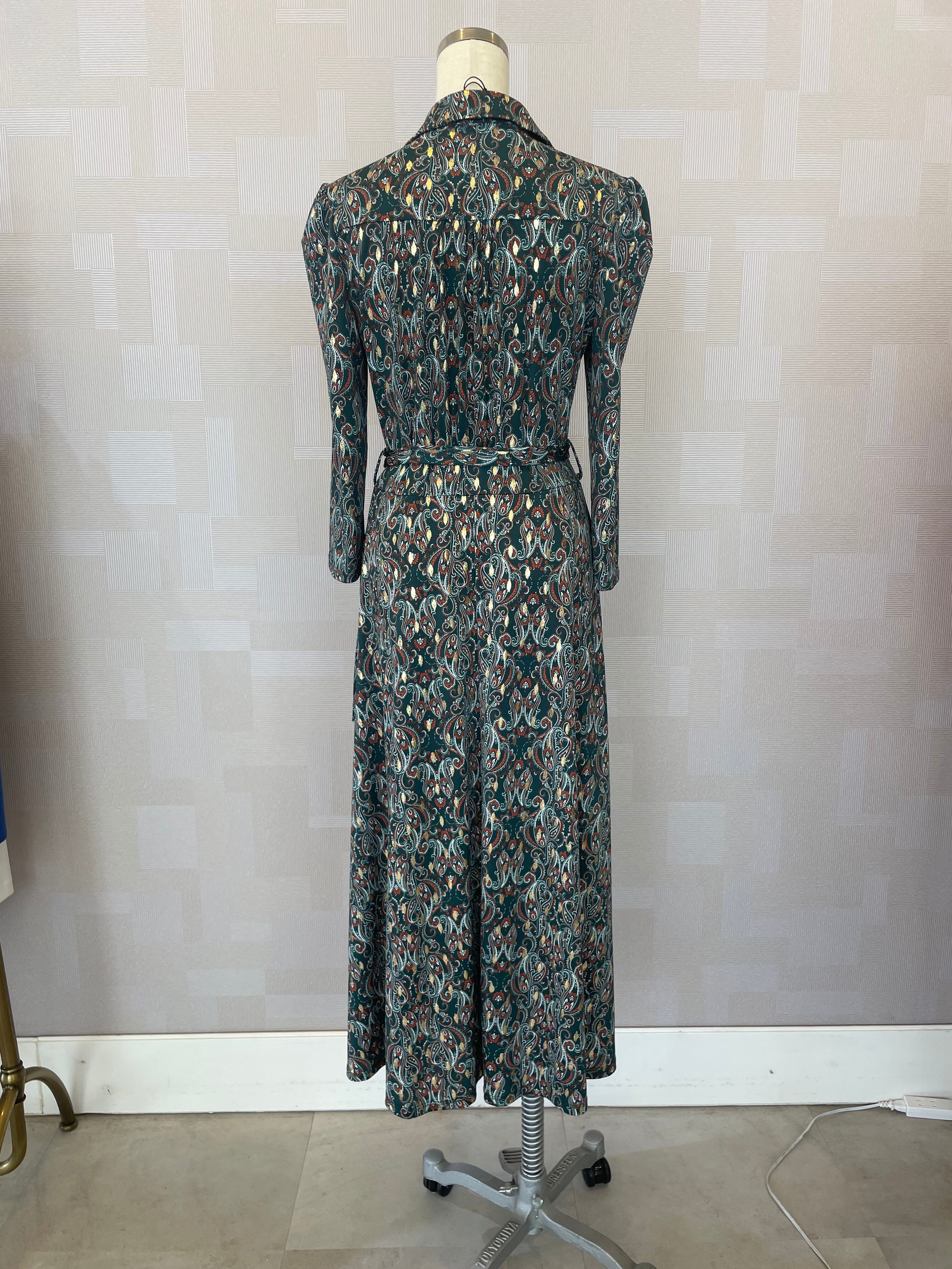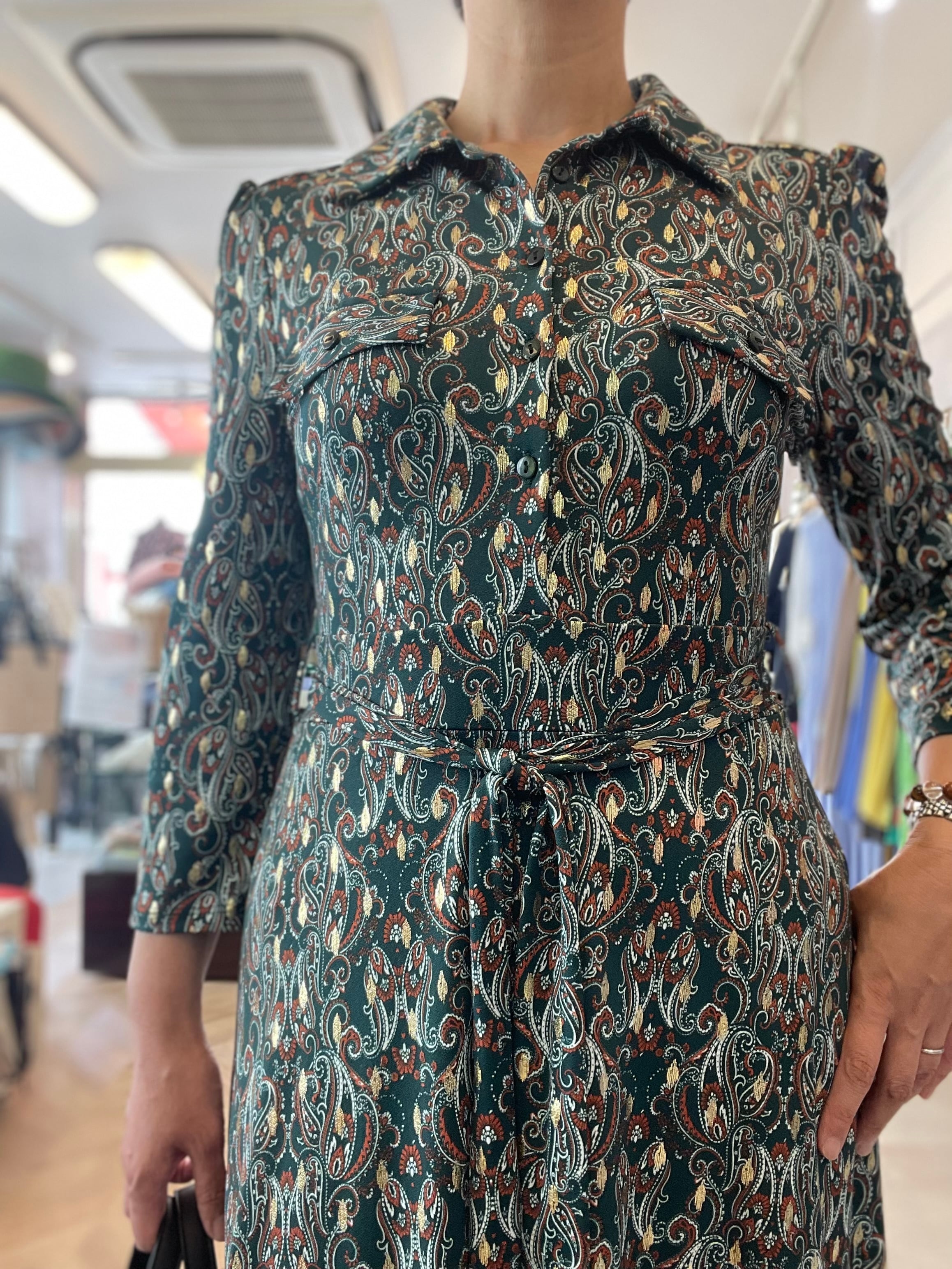 キラリ ゴールドがアクセントのペイズリー柄ワンピース グリーン フランス製