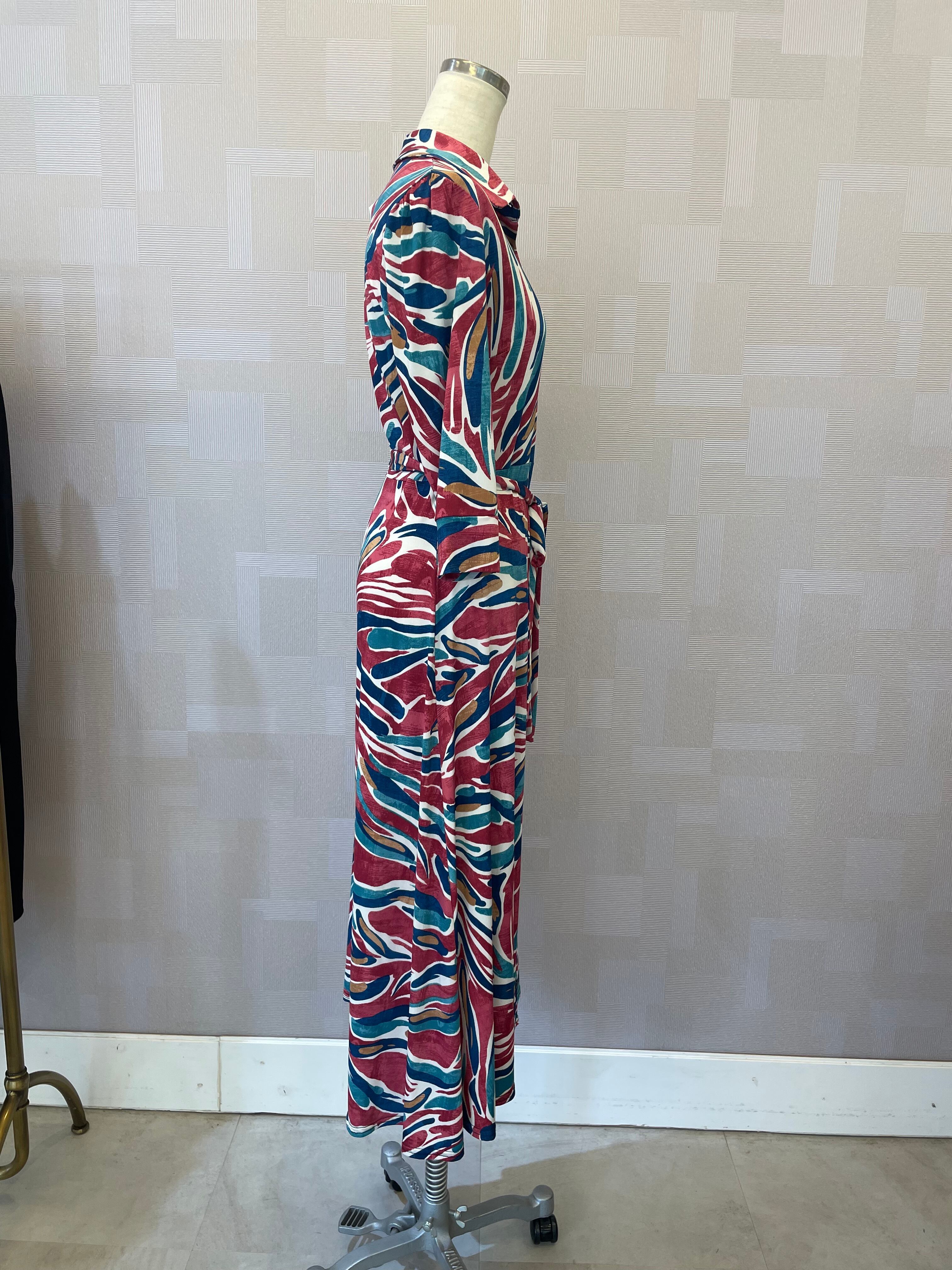 鮮やかなピンクやブルーの大胆な曲線柄が