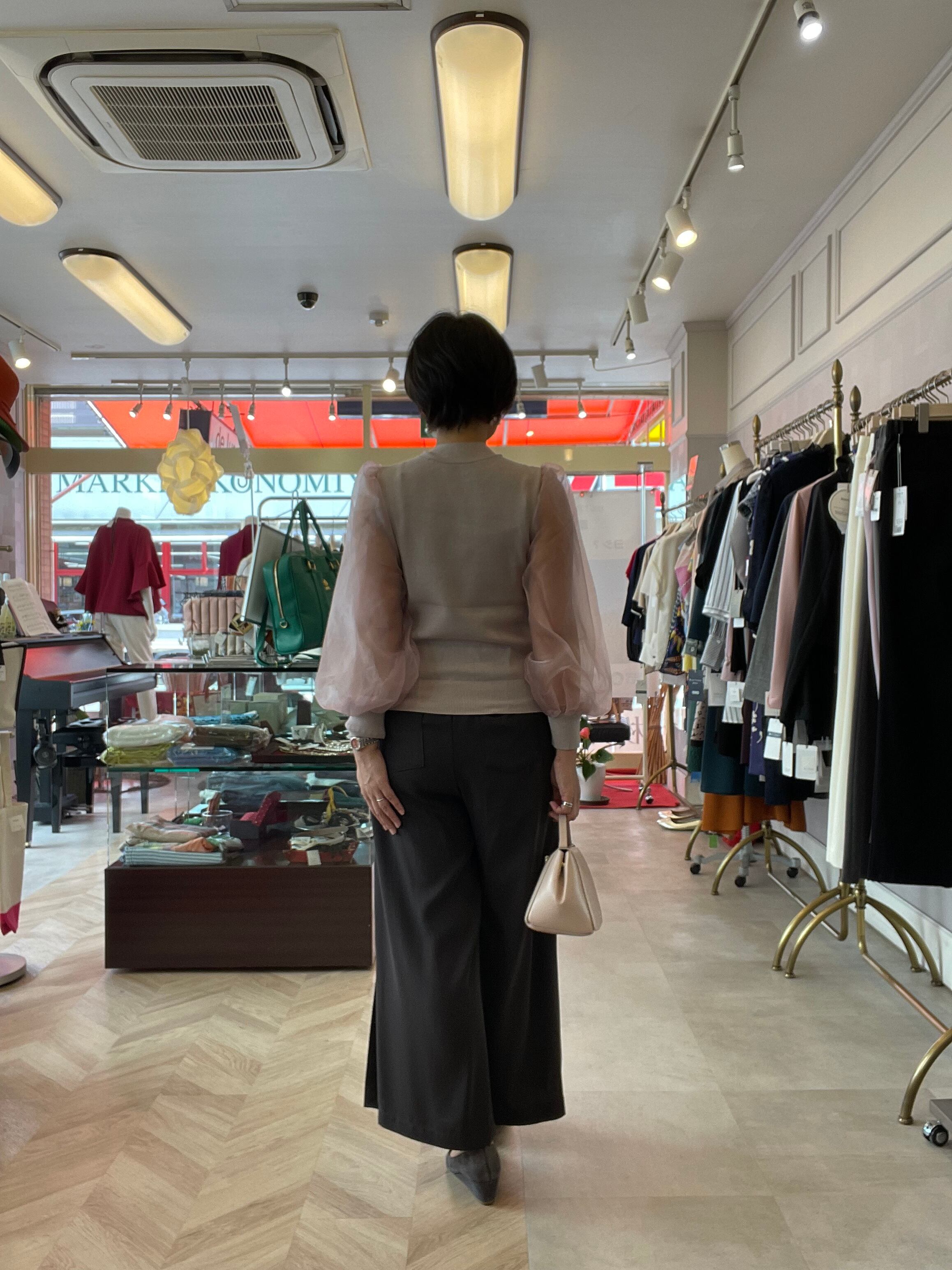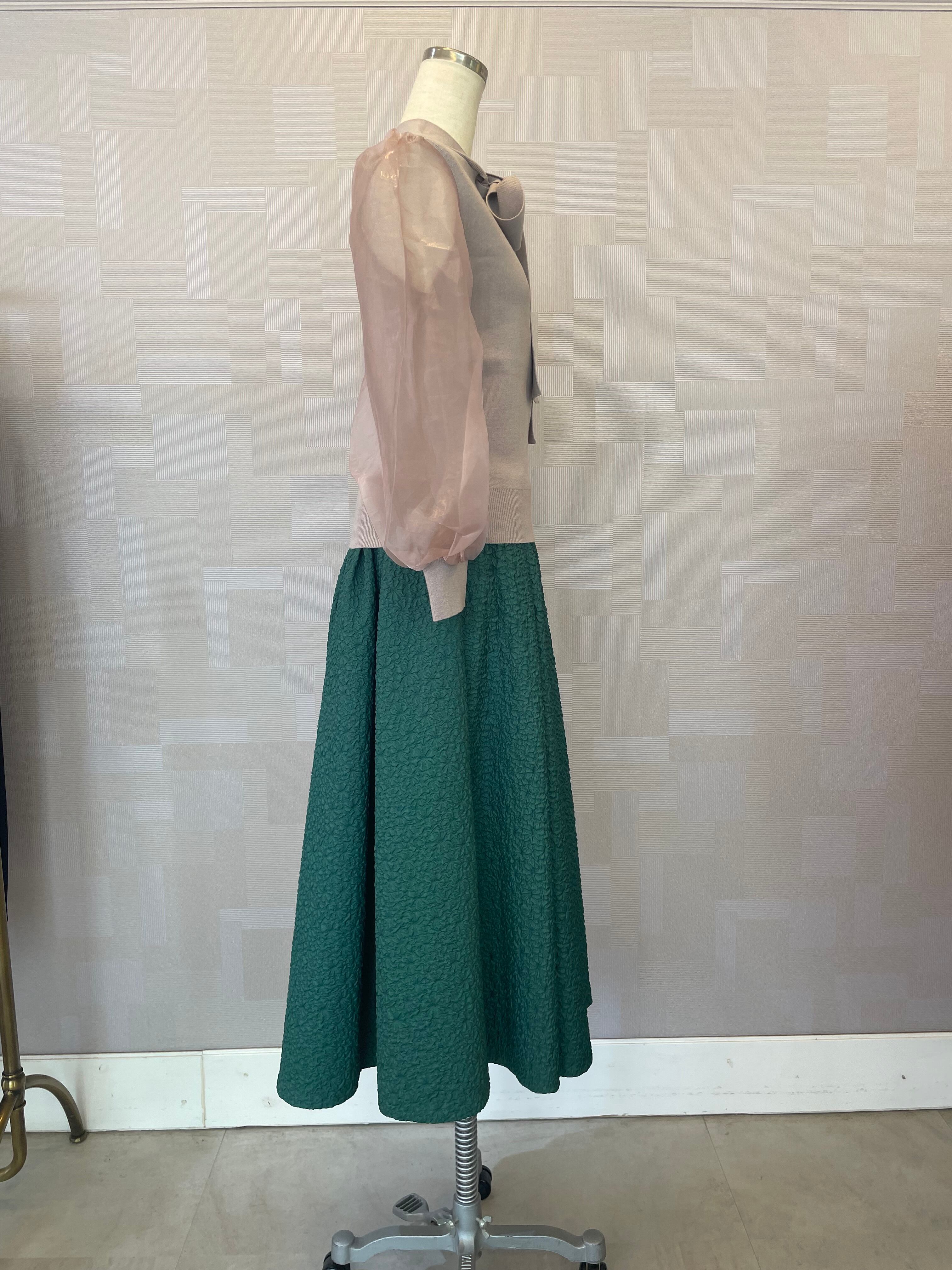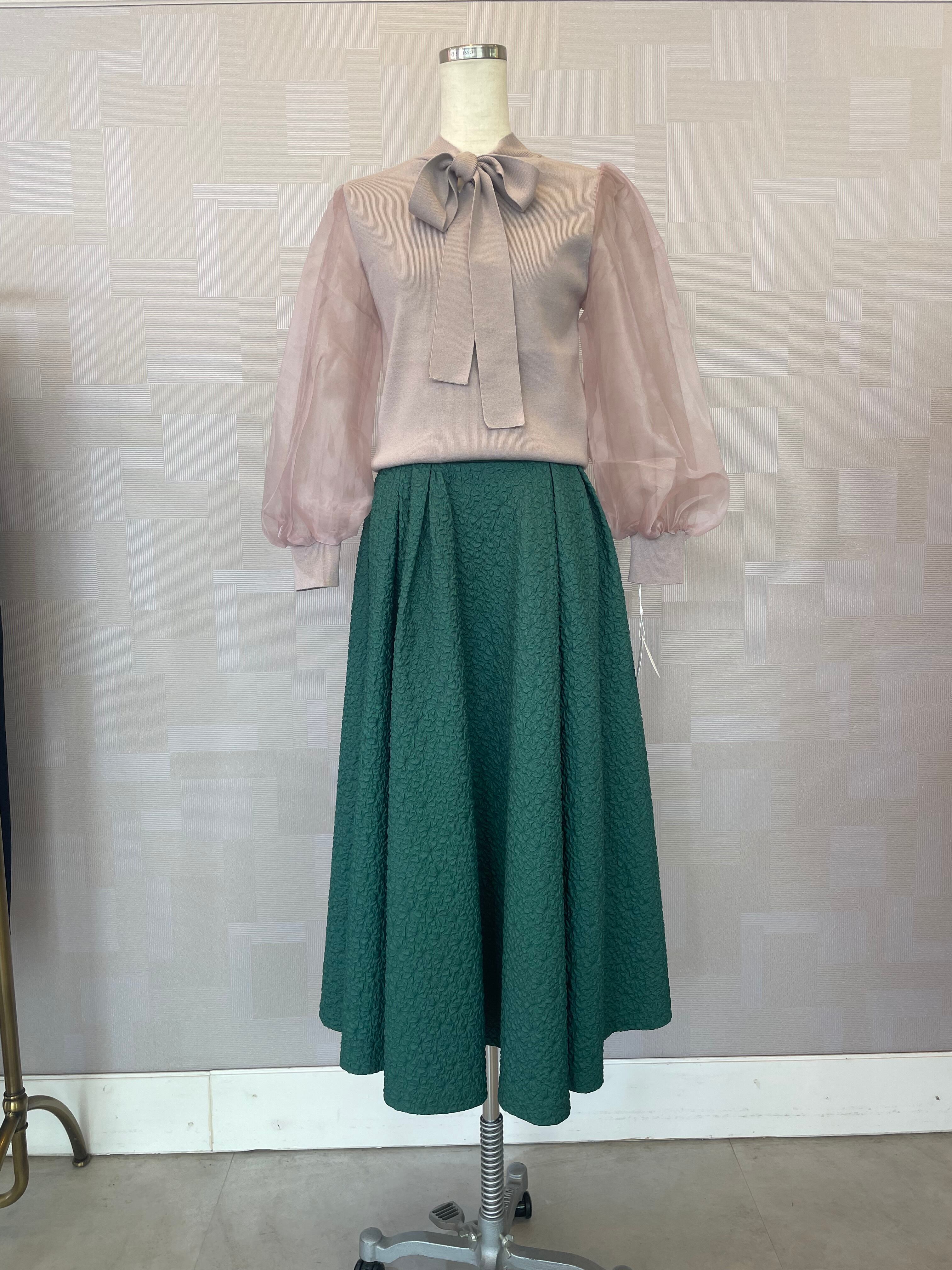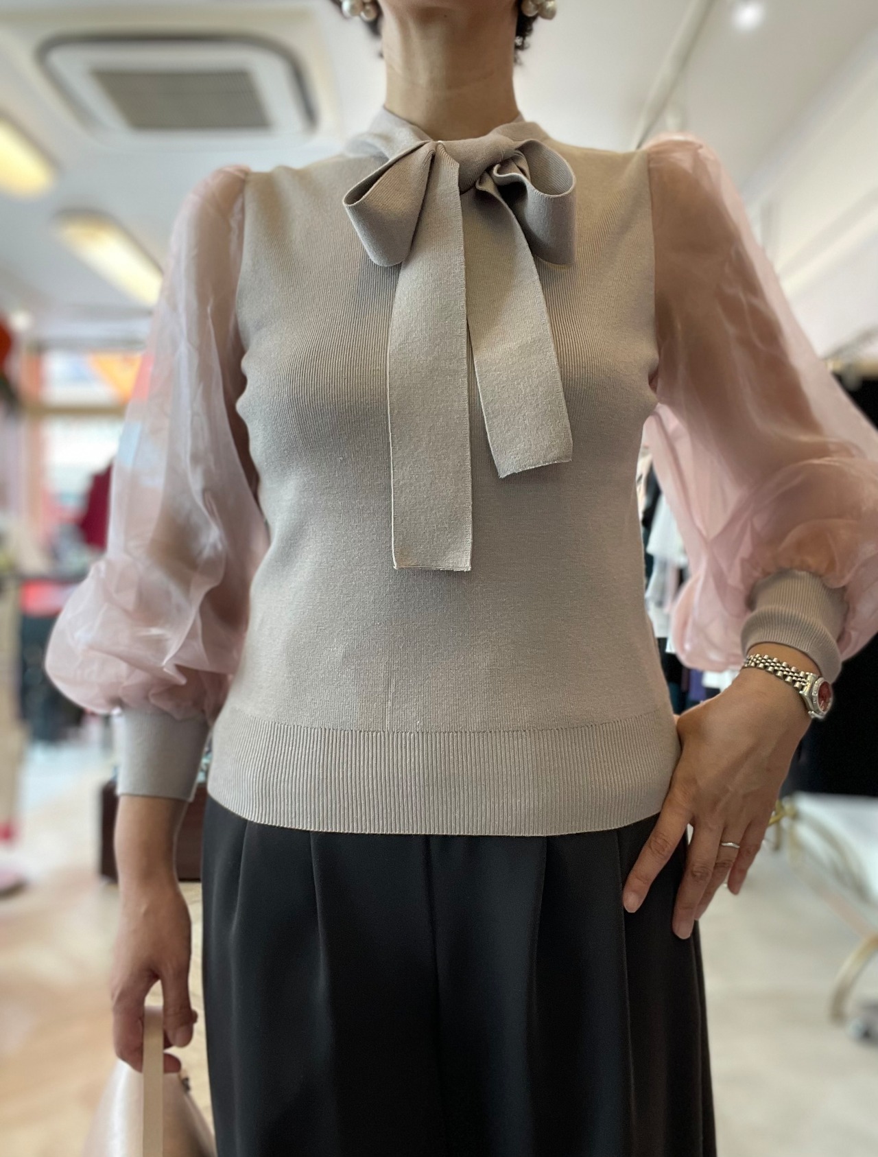袖オーガンジー リボンニット ピンク フェミニン お出かけ パーティ