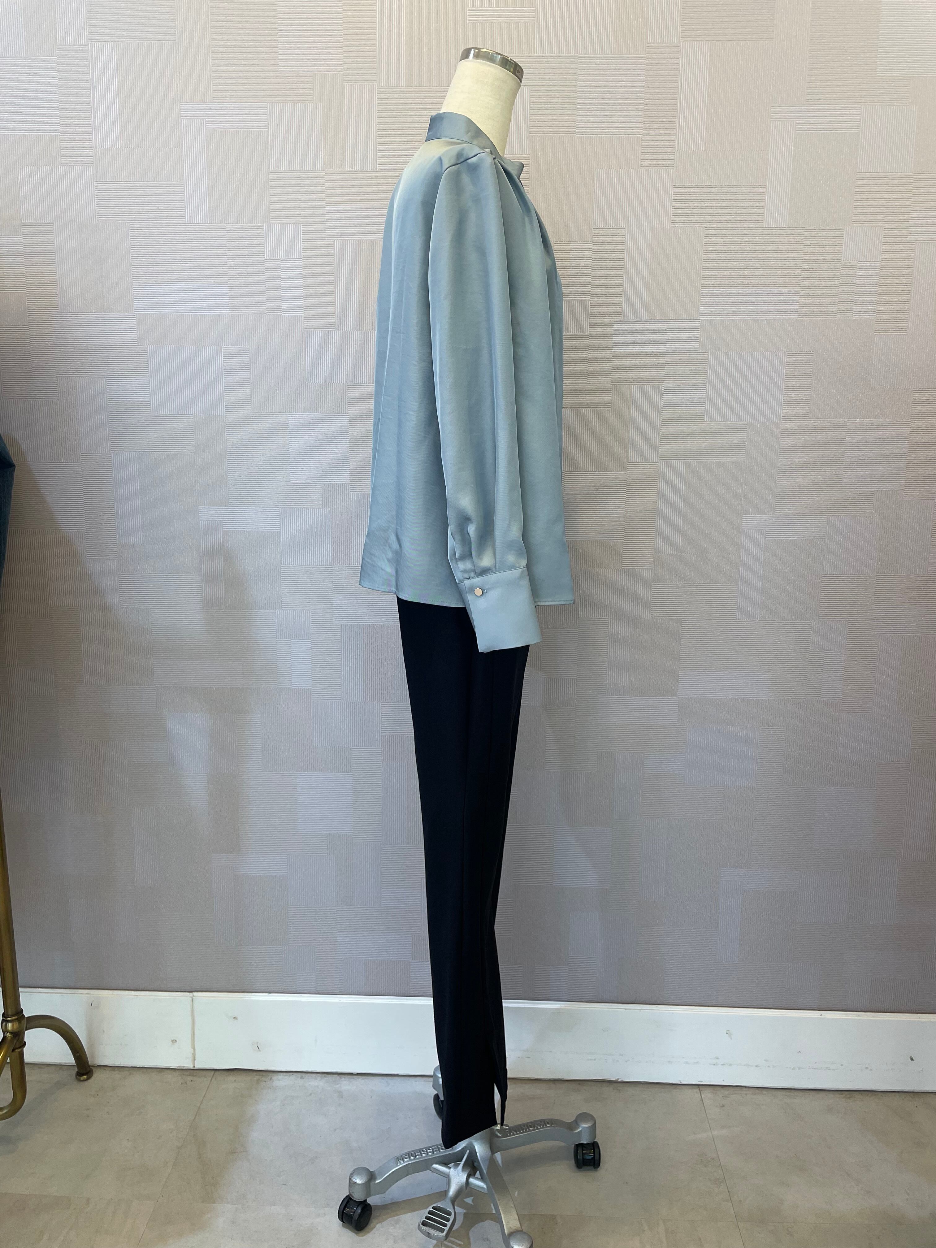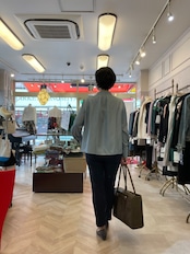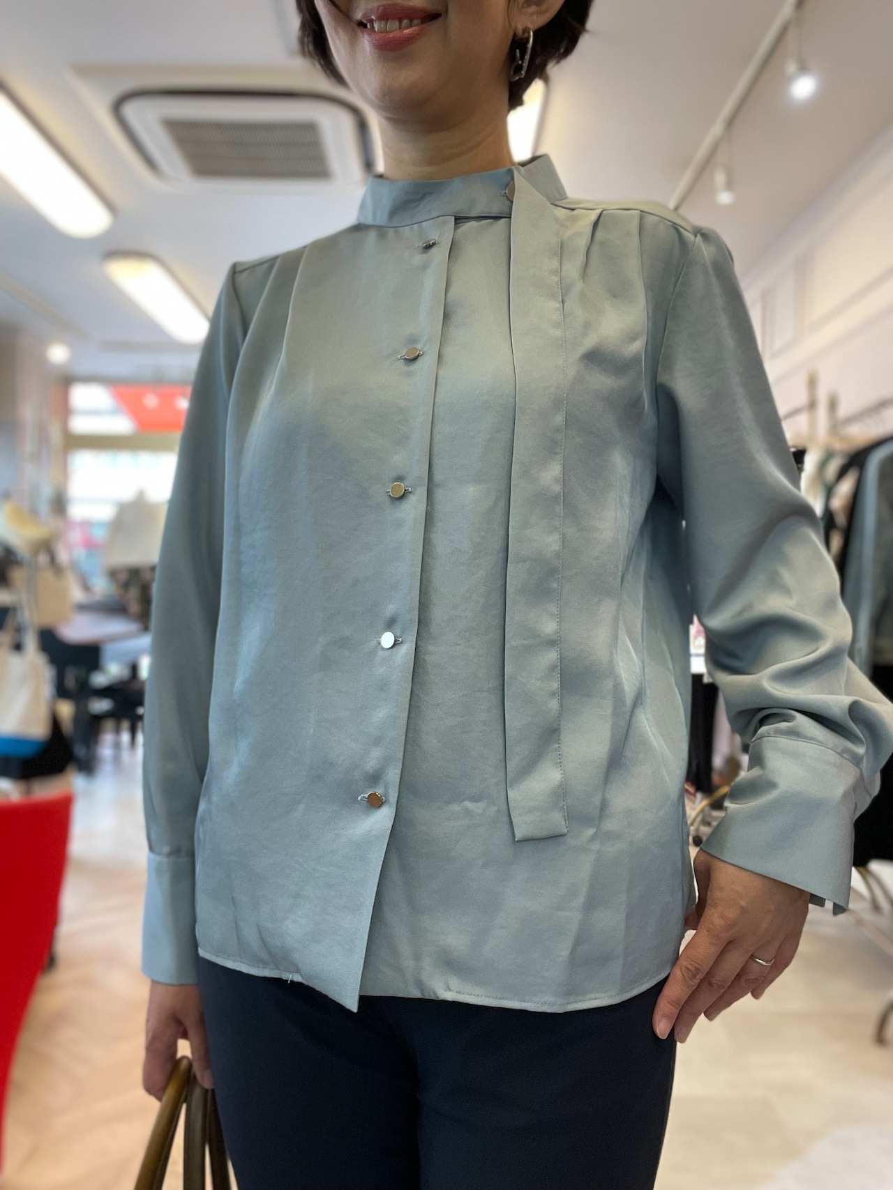ボタンで留めたボウタイ風のリボンがアクセントに