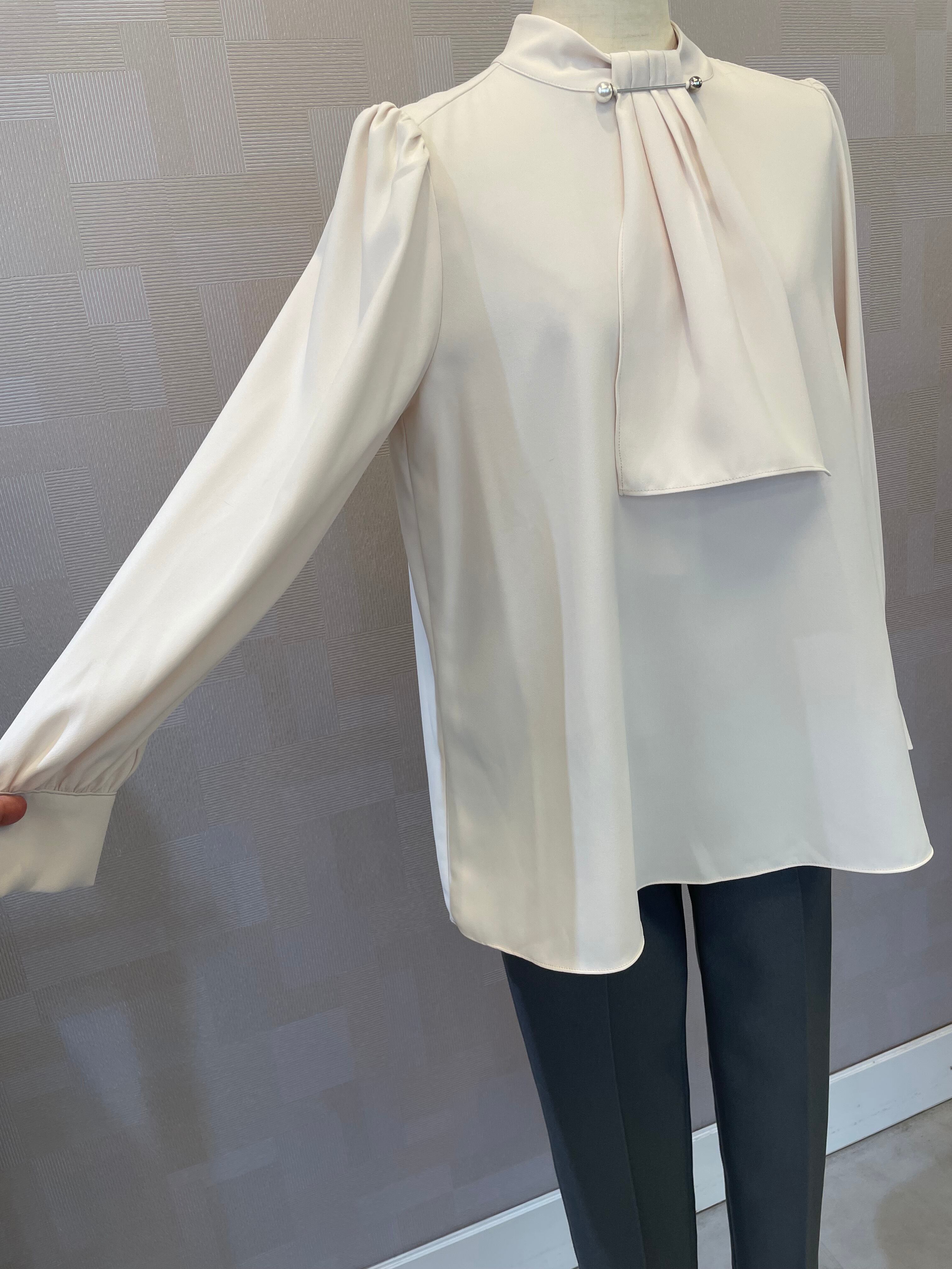 襟元のバー×リボンがパッとお顔周りを華やかに見せるブラウス
