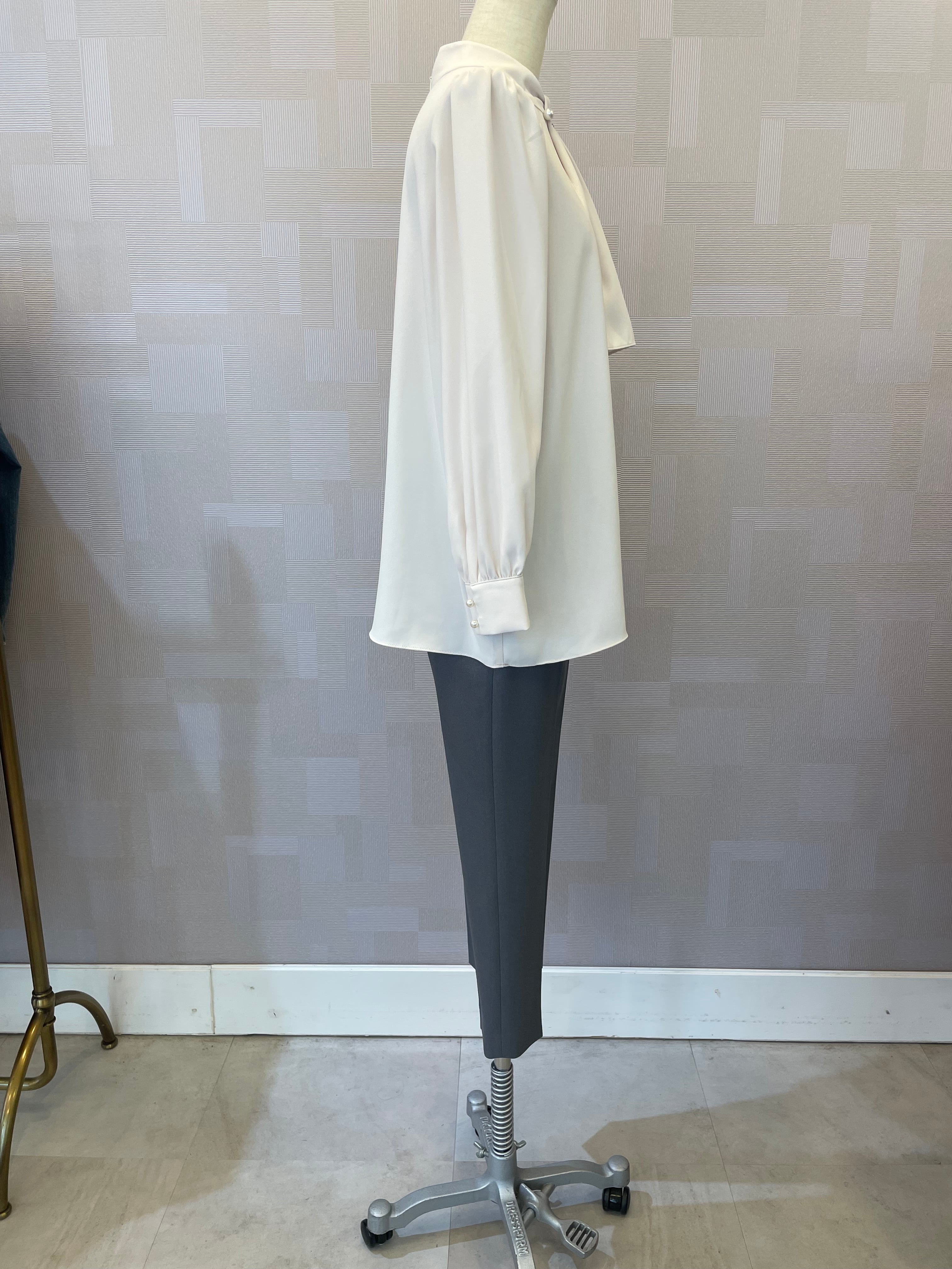 リボン×バー エレガントブラウス 袖パールボタン オフホワイト お仕事 式典 パーティ