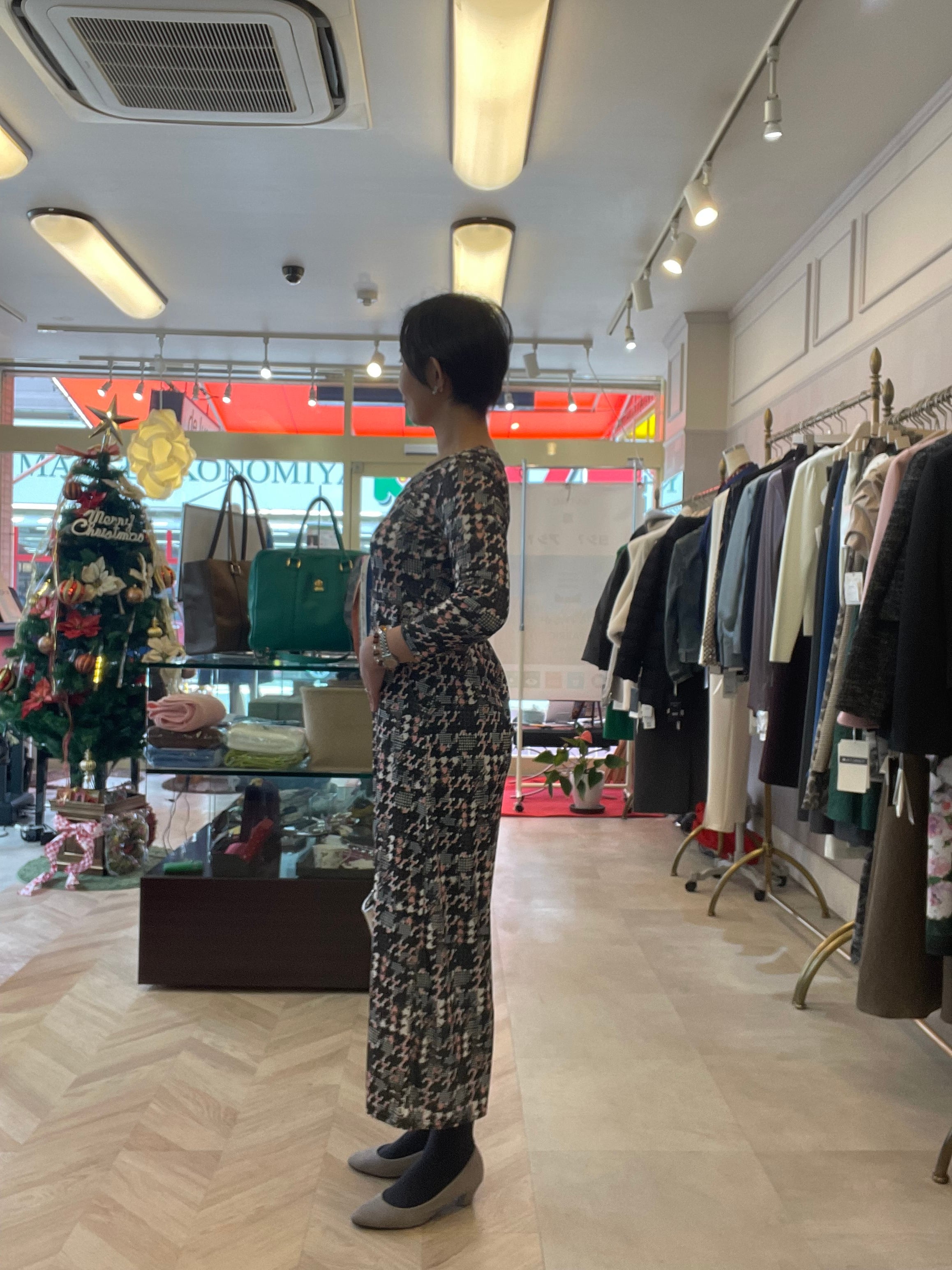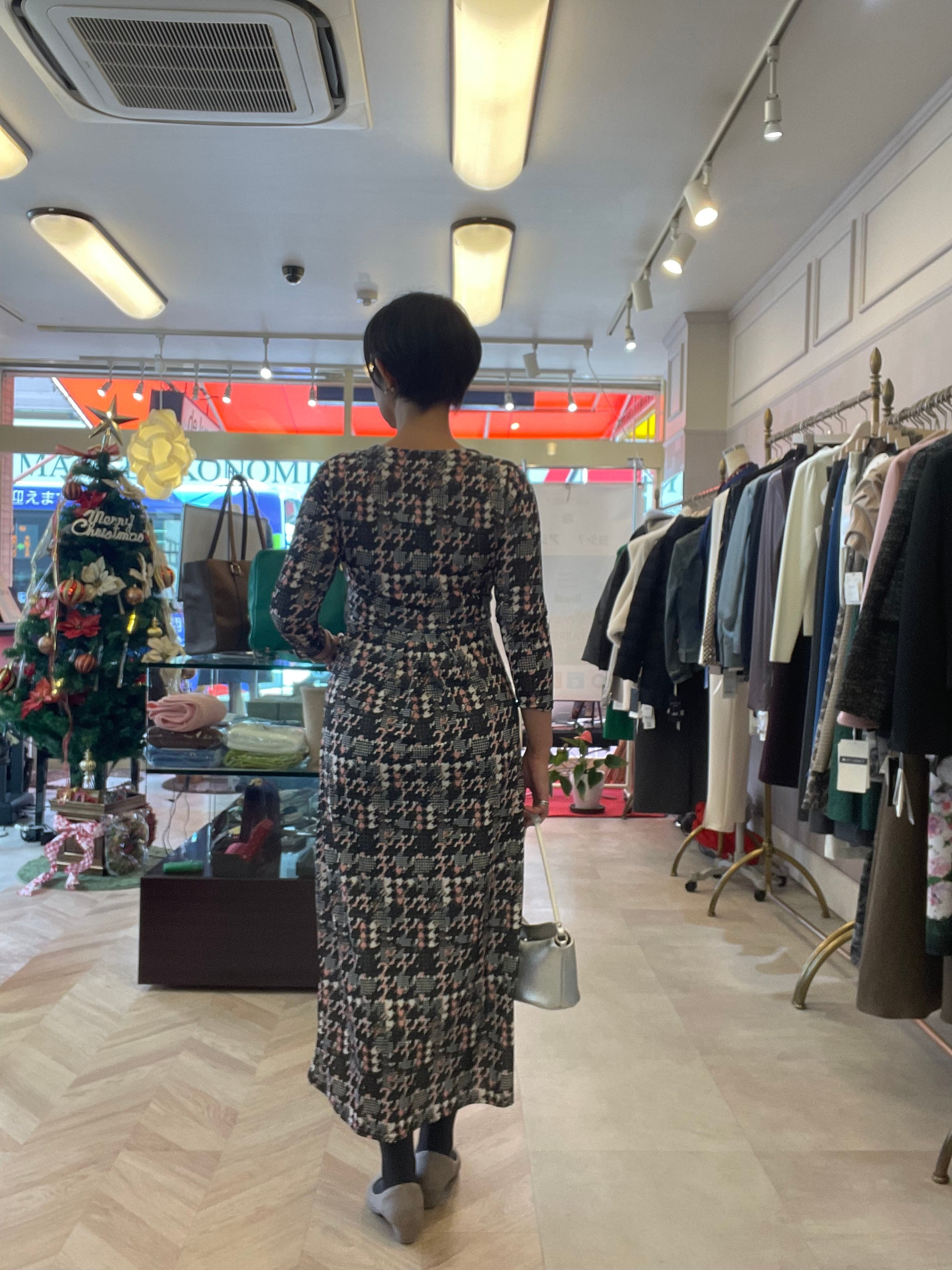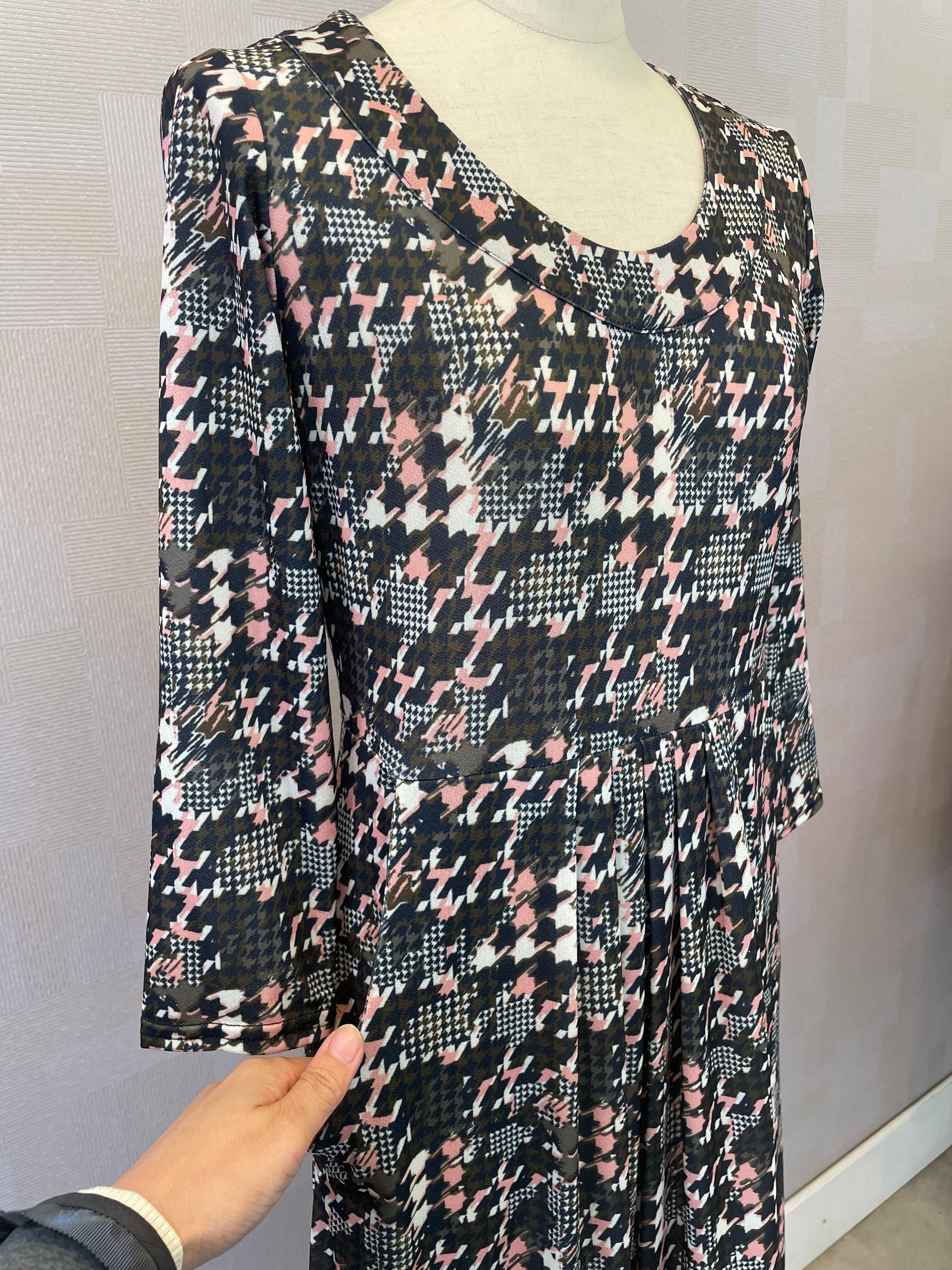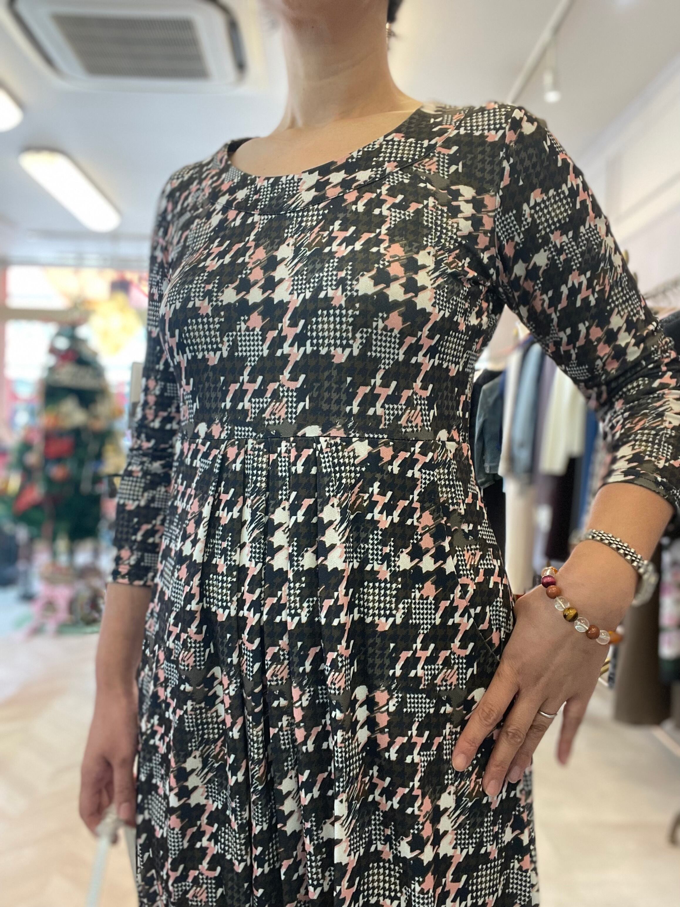 ピンクやカーキのカラーで華やかめの千鳥柄ワンピース