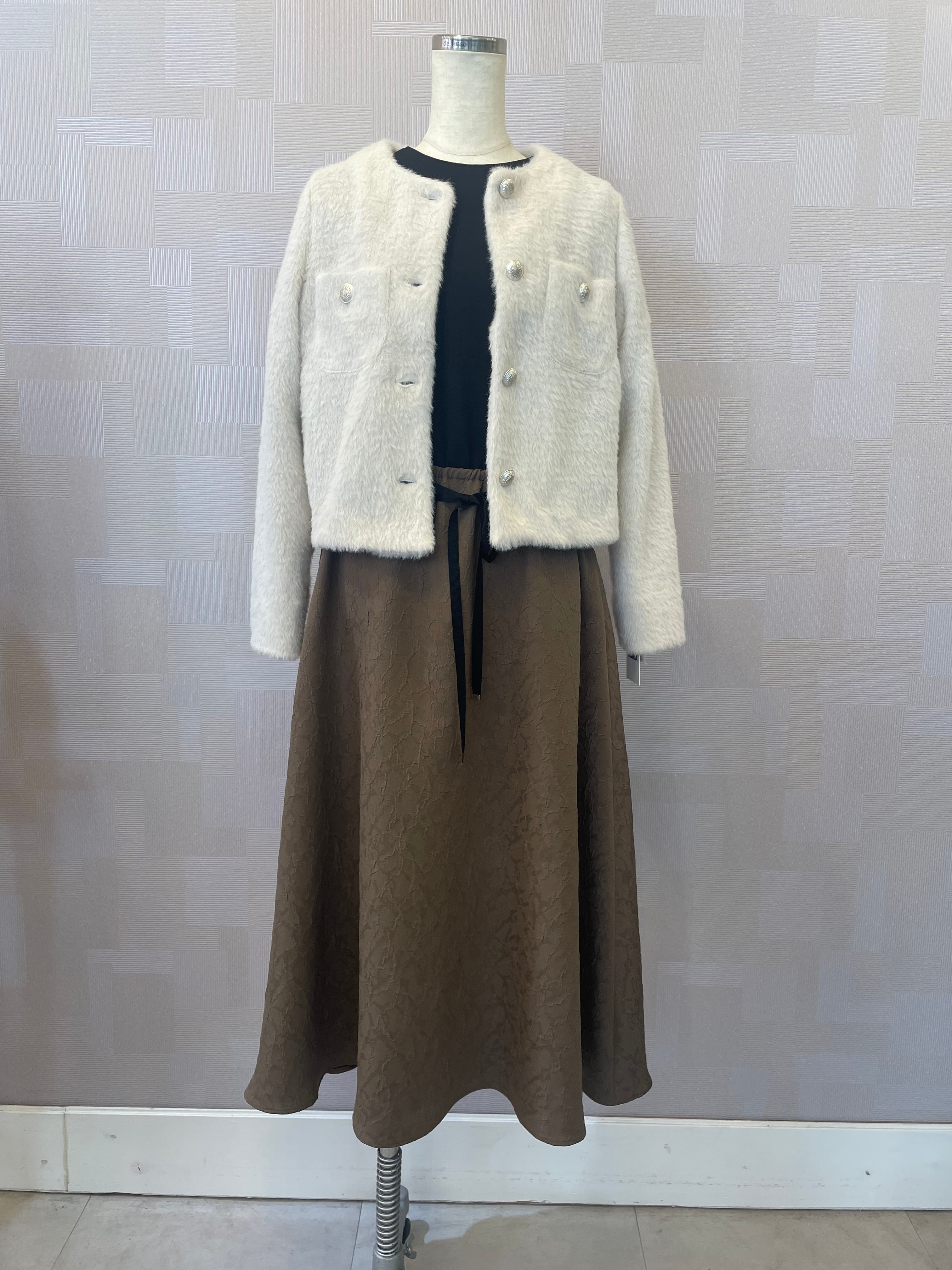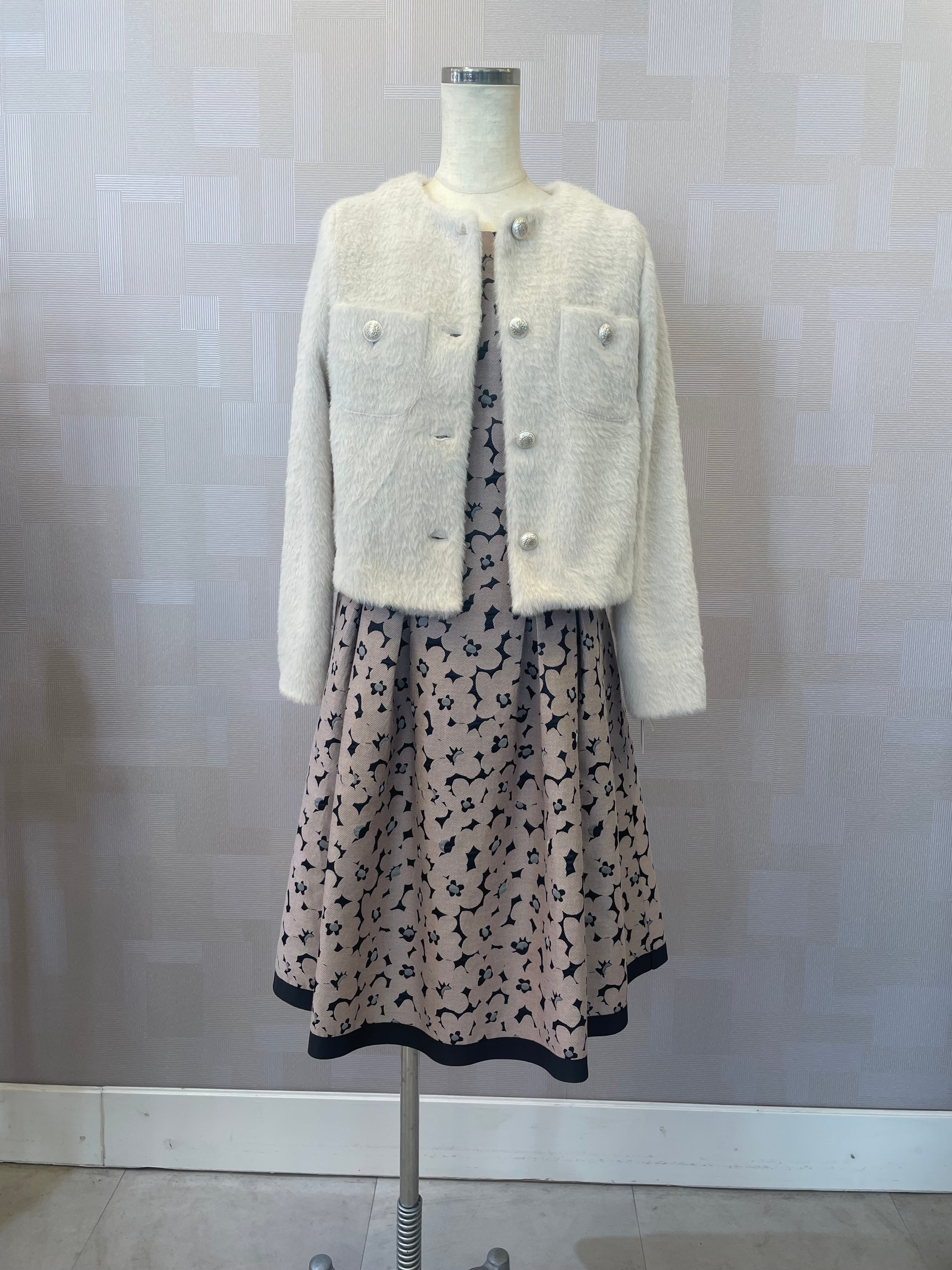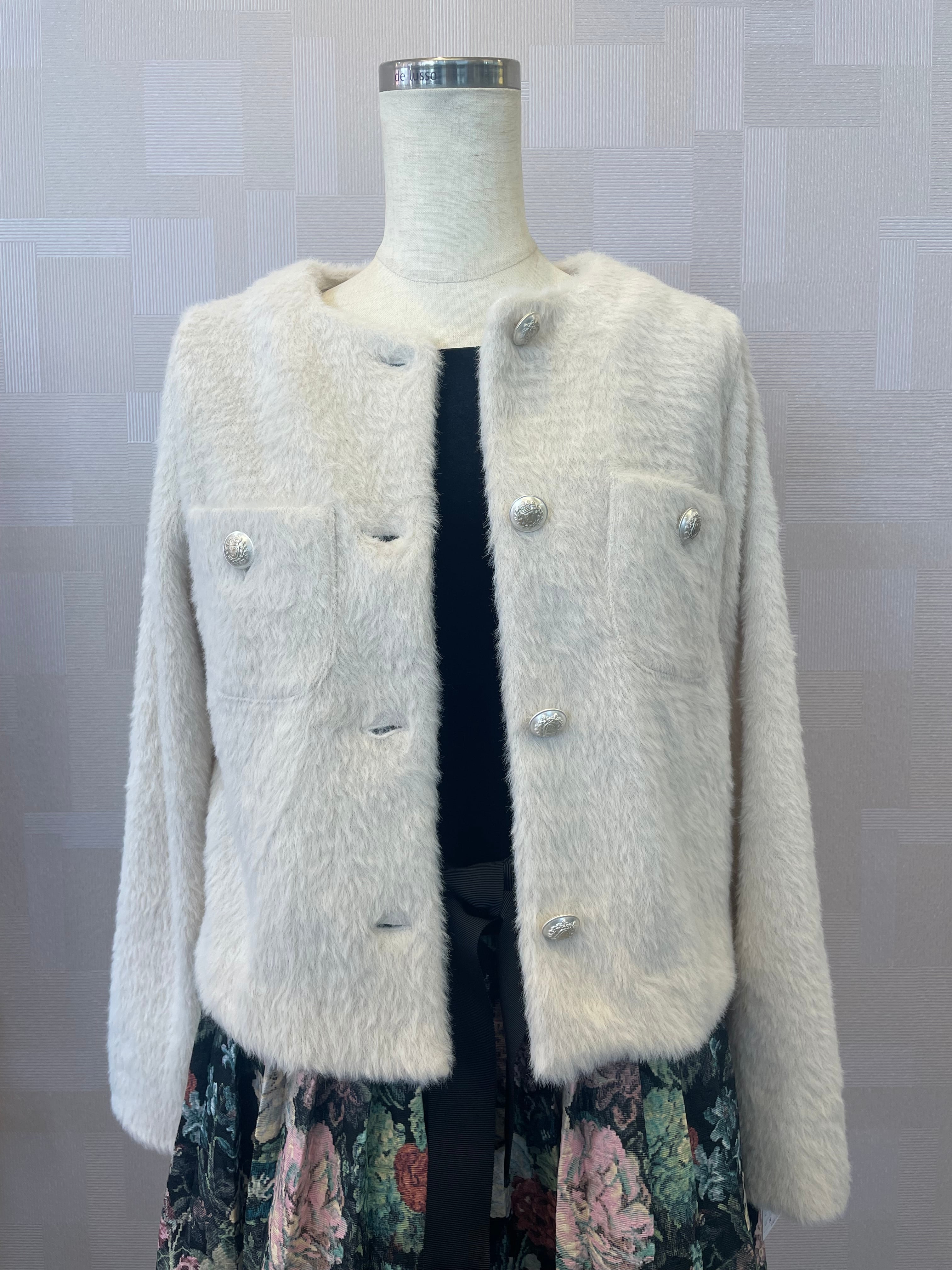 洗えるシャギーニットジャケット ノーカラー オフホワイト 冬ワンピースの羽織りに