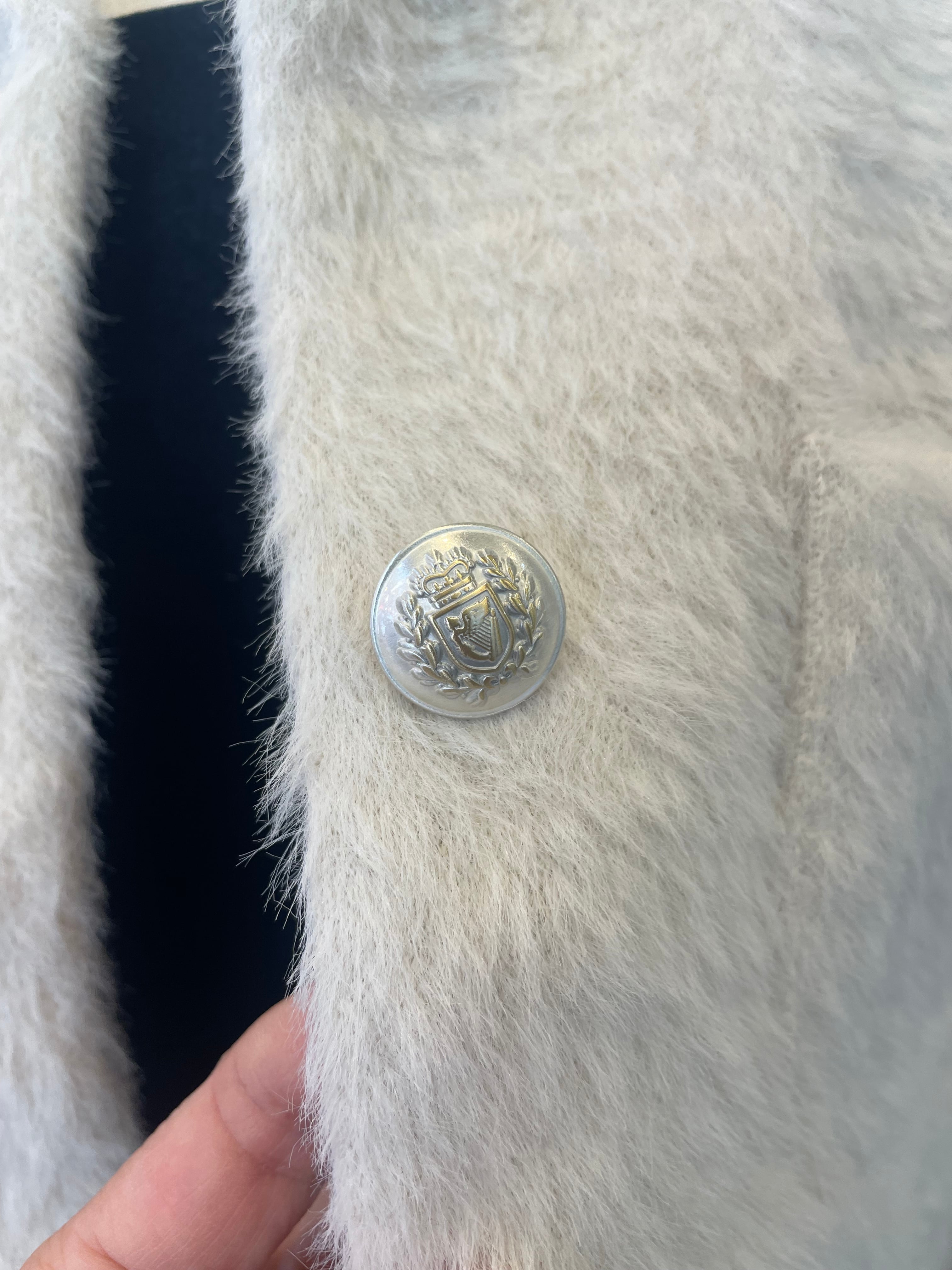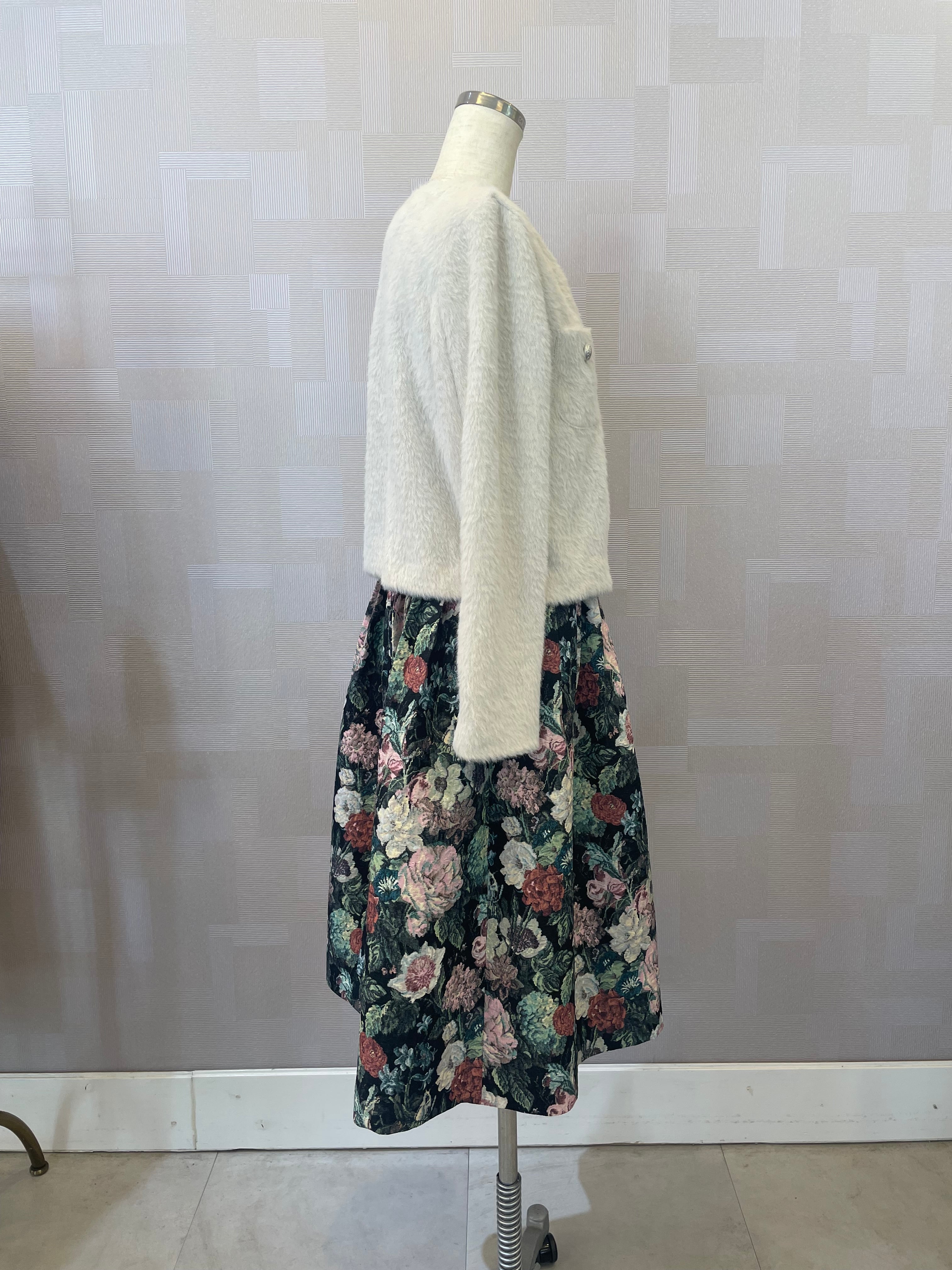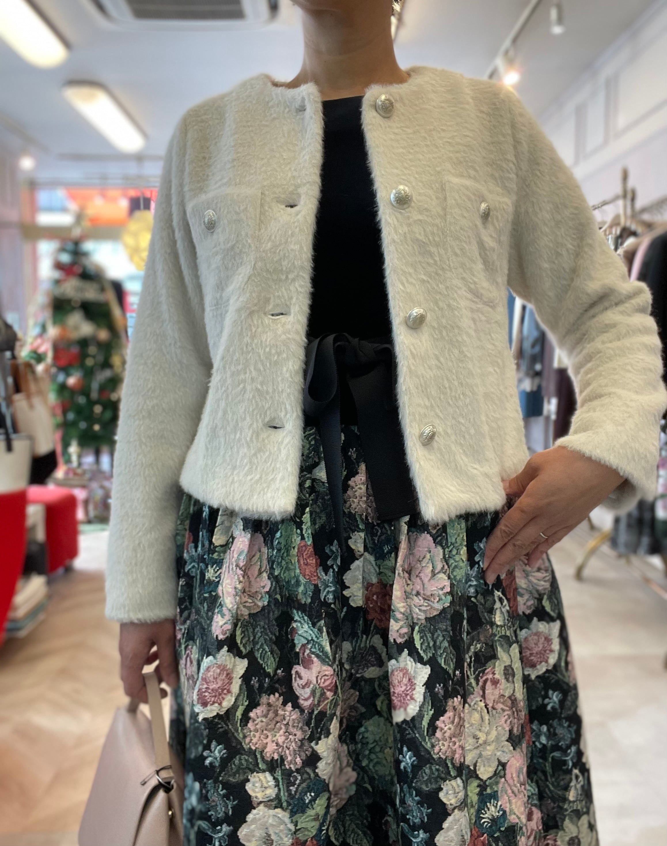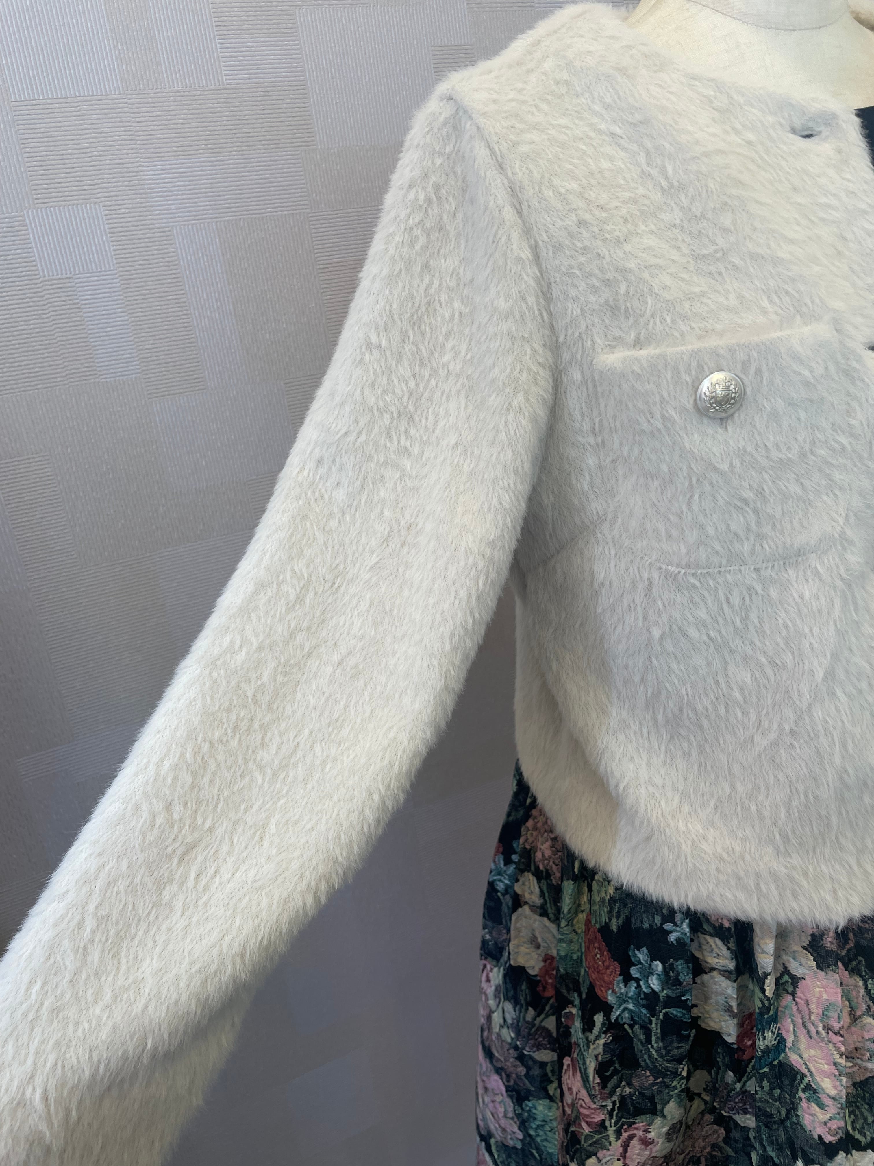 洗えるシャギーニットジャケット ノーカラー オフホワイト 冬ワンピースの羽織りに