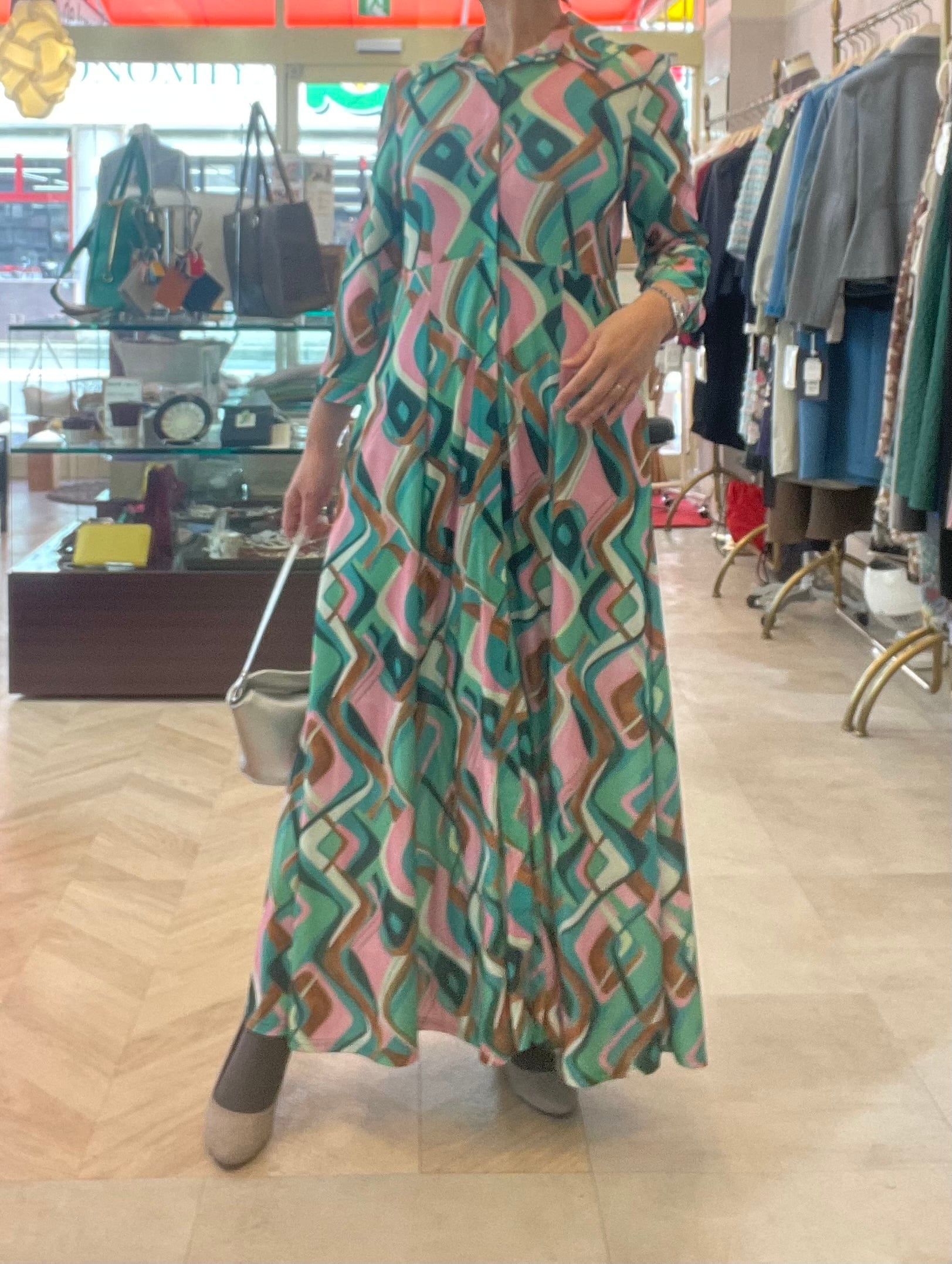 鮮やかな色と柄がパッと目を惹くマキシ丈ワンピース