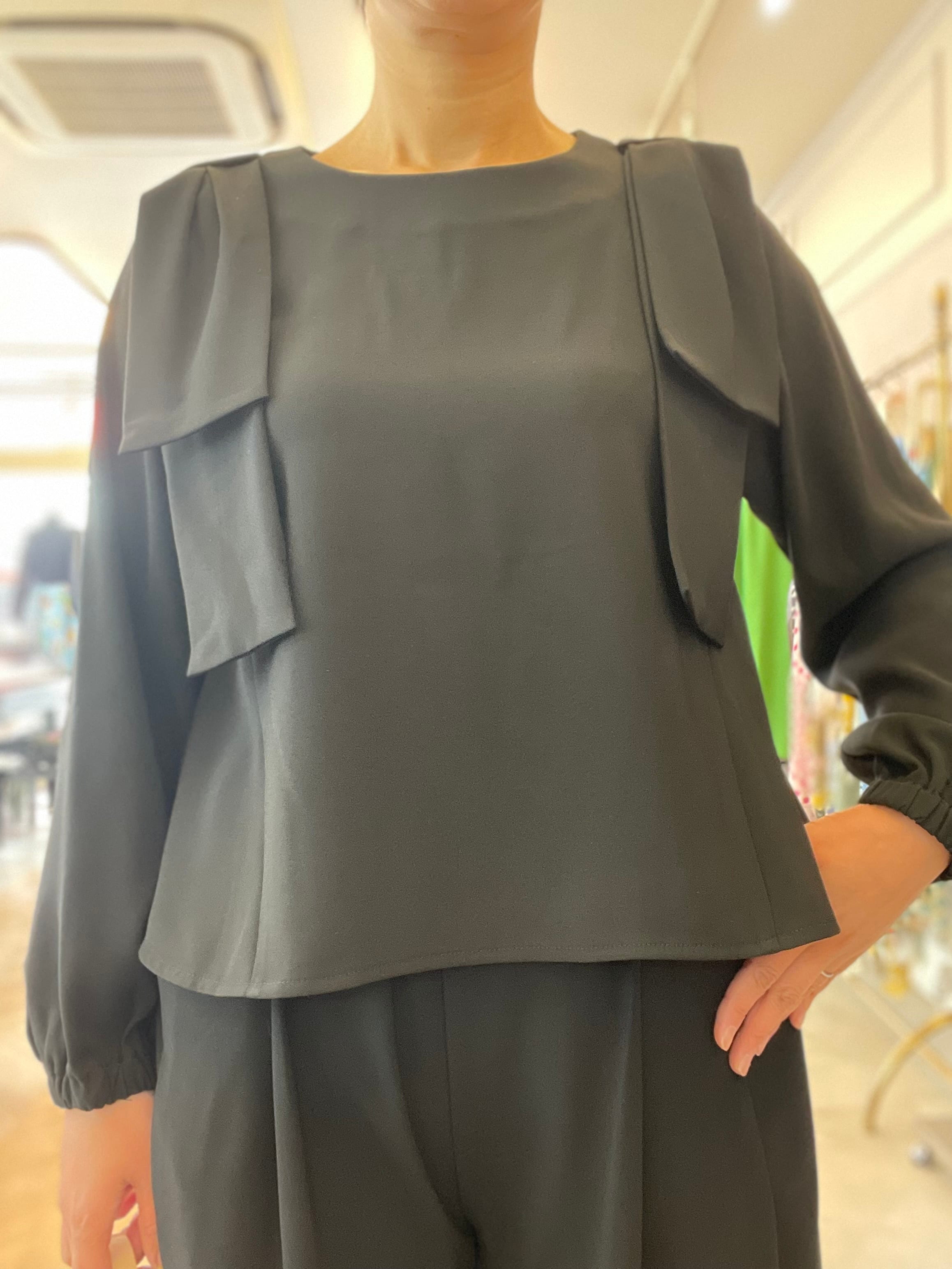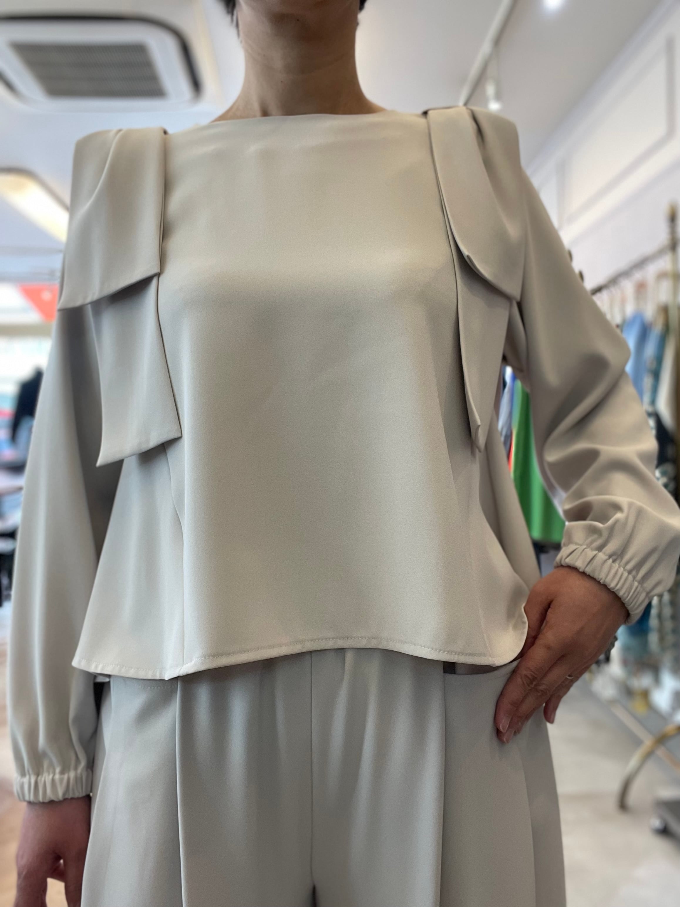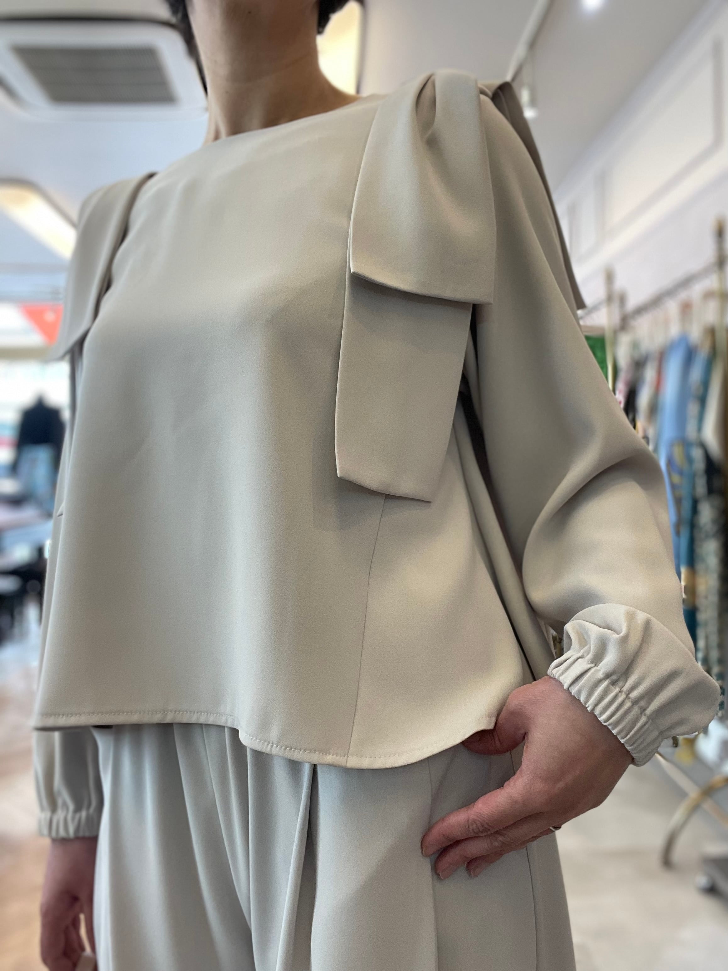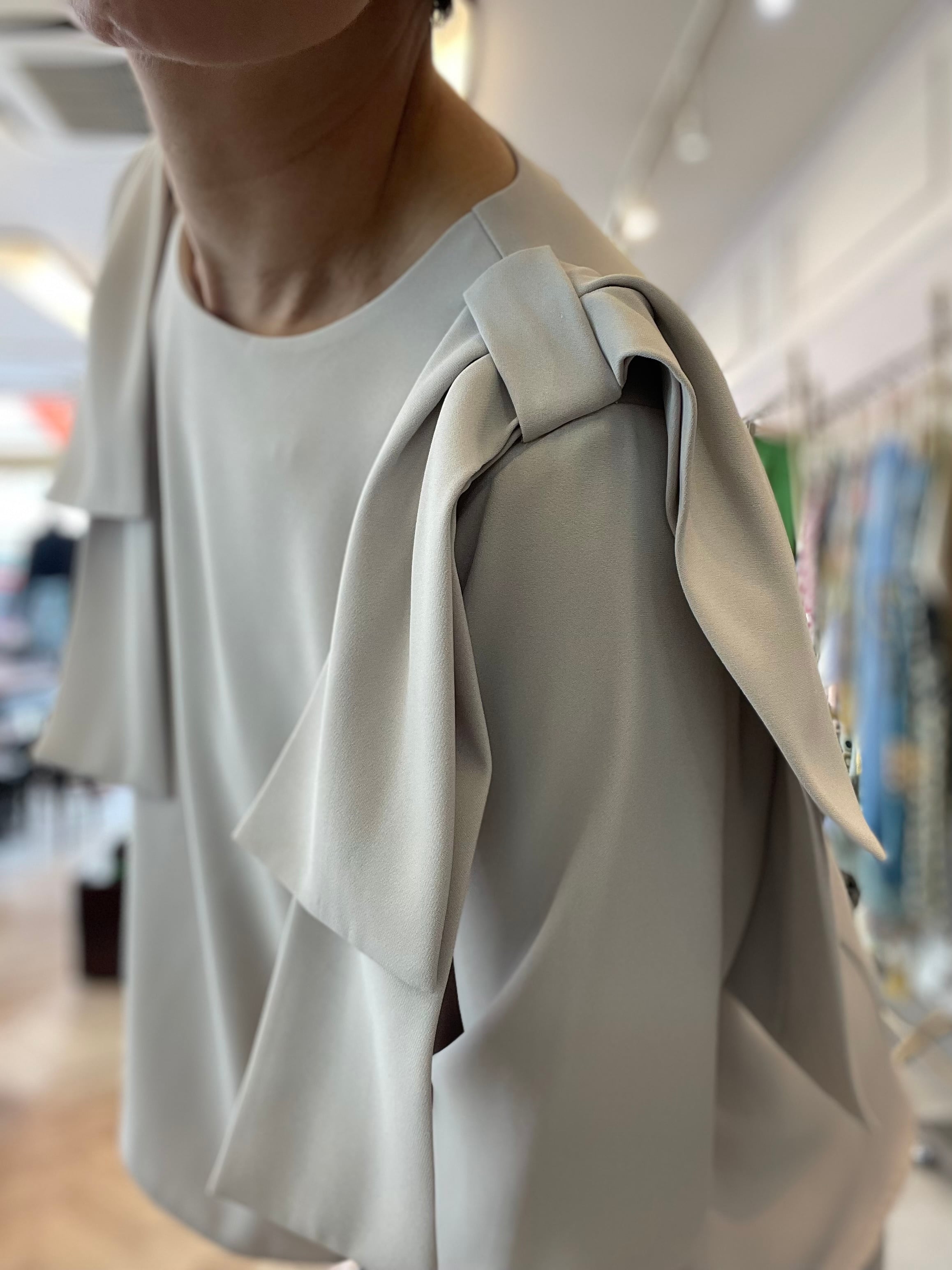 トップスの肩にあしらわれたリボンデザインが