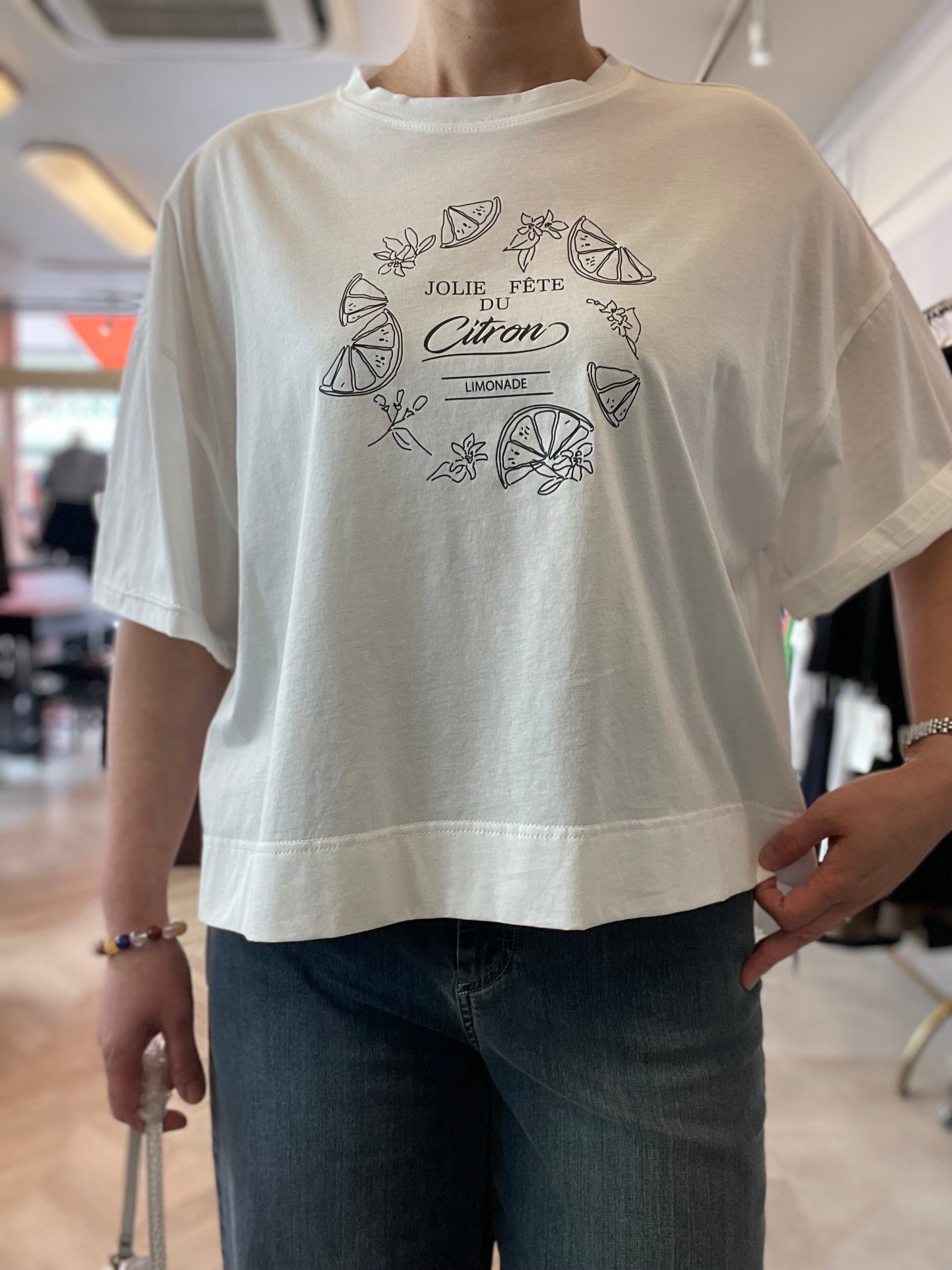 爽やか シトラス柄Tシャツ ホワイト、グリーン 大人のためのきれいめTシャツ|体型カバー×上質素材で叶う美シルエットカットソー