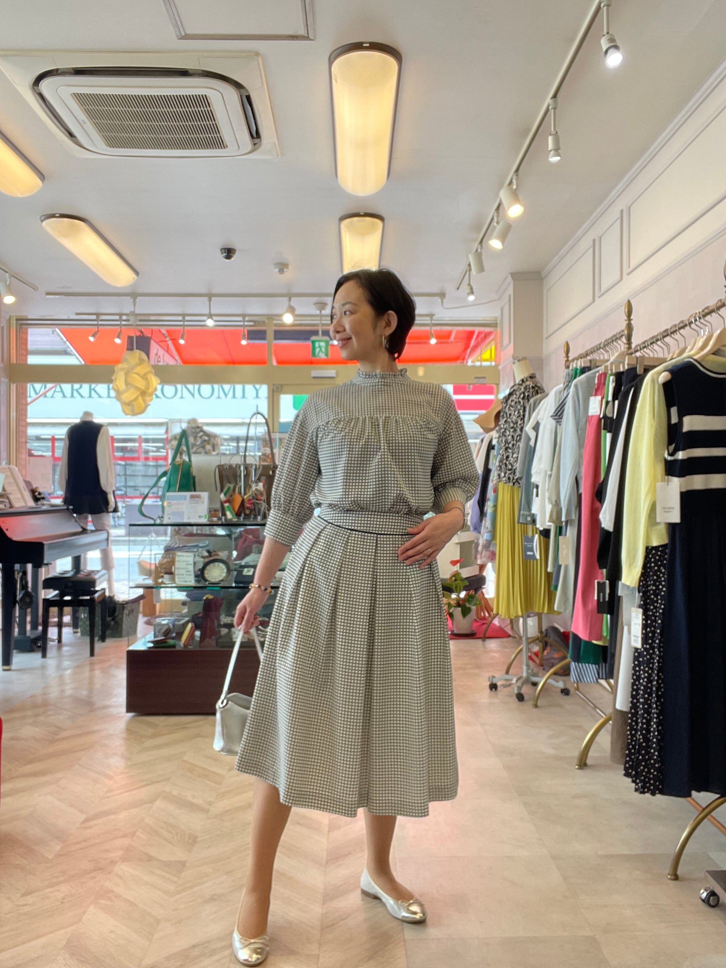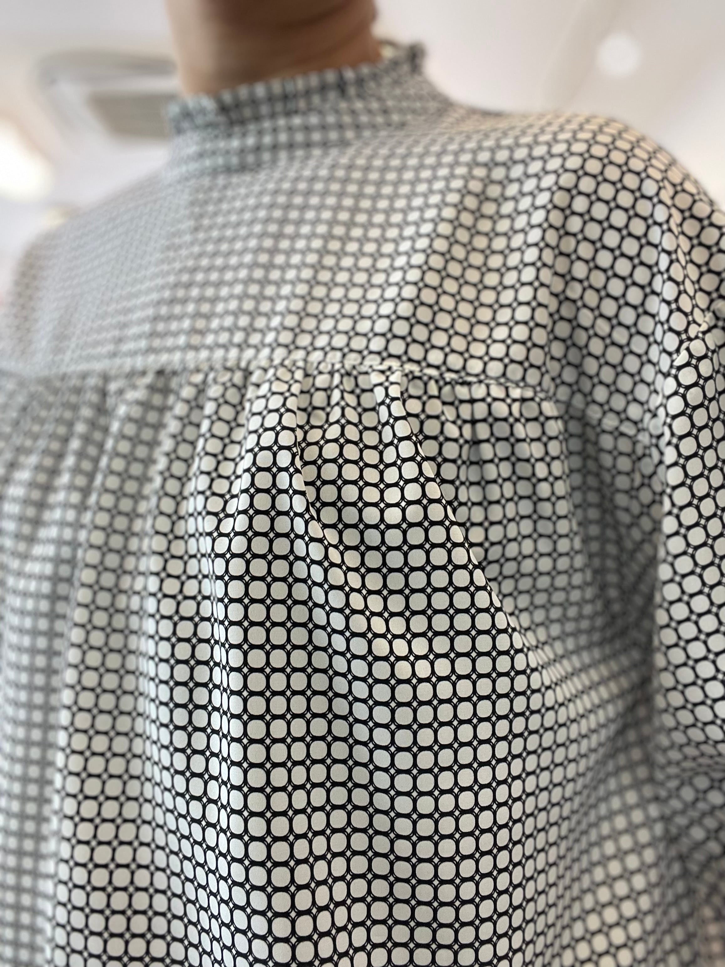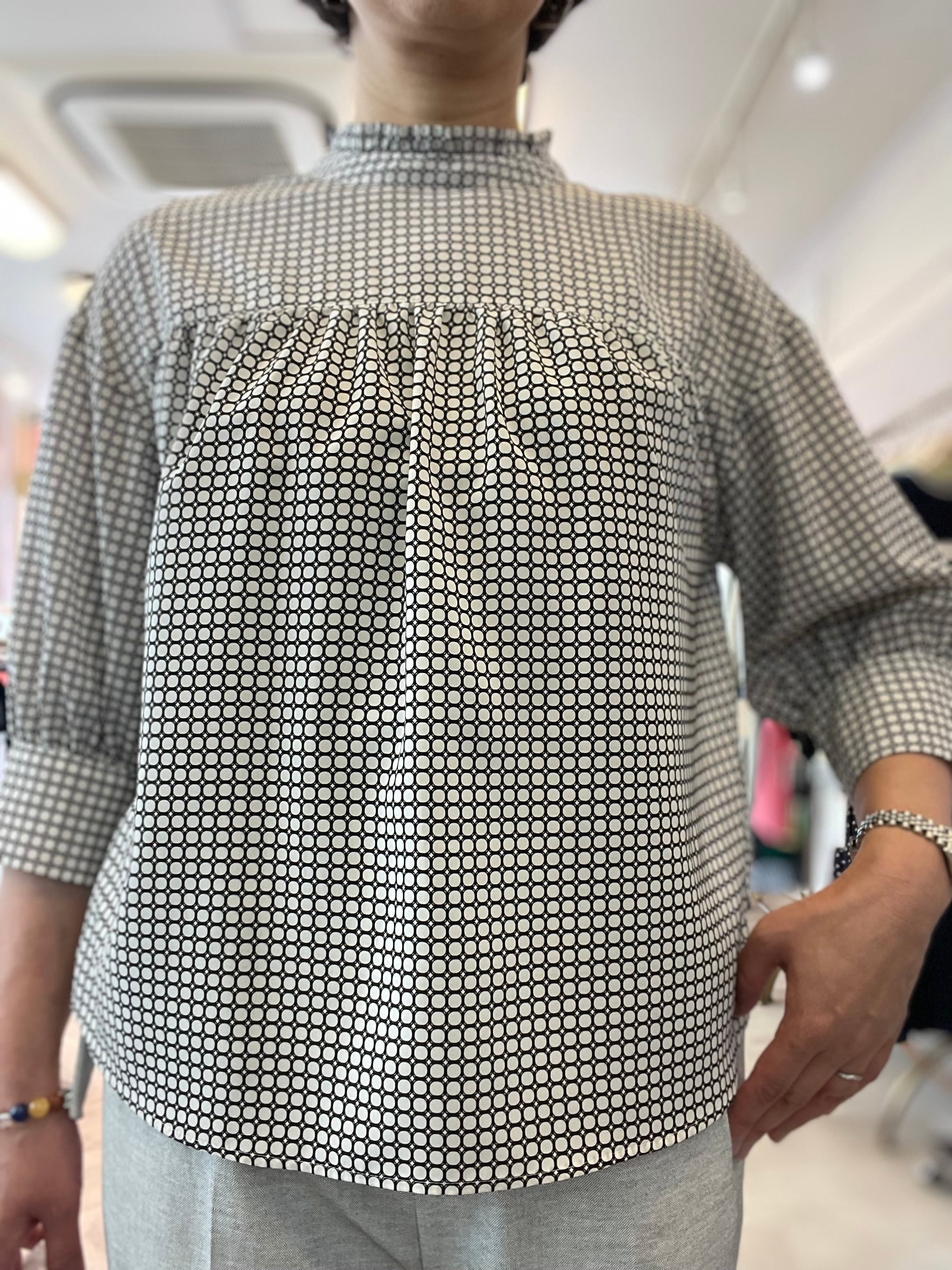 胸の切り替え、フリルスタンドカラーがきれいめなブラウスです