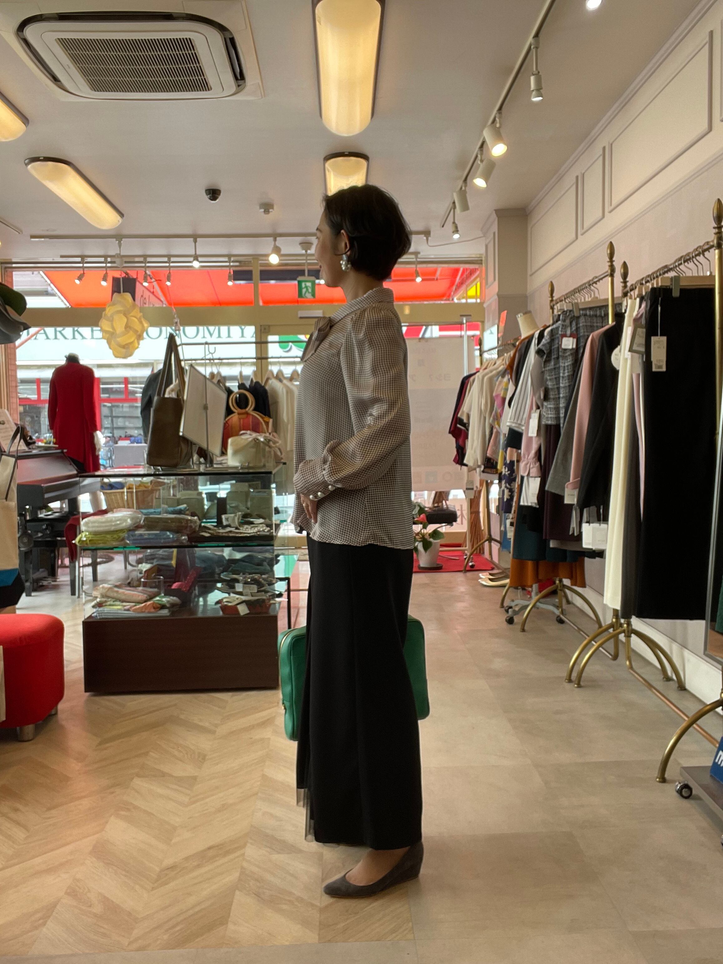 上品な光沢感が美しいピンク×ブラックの柄ブラウスです