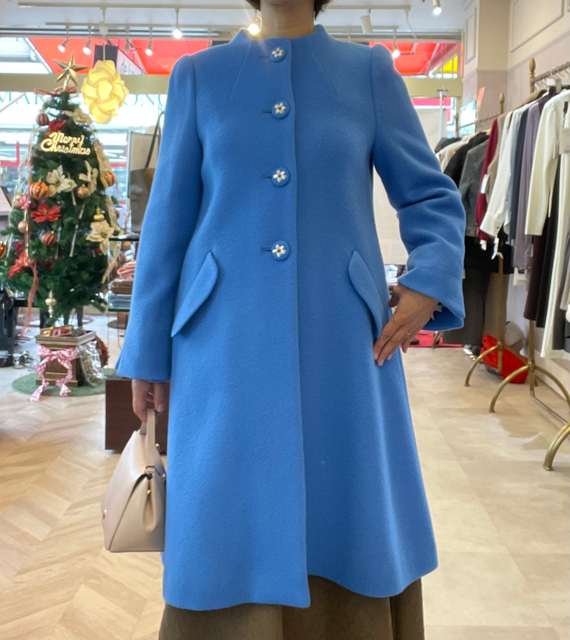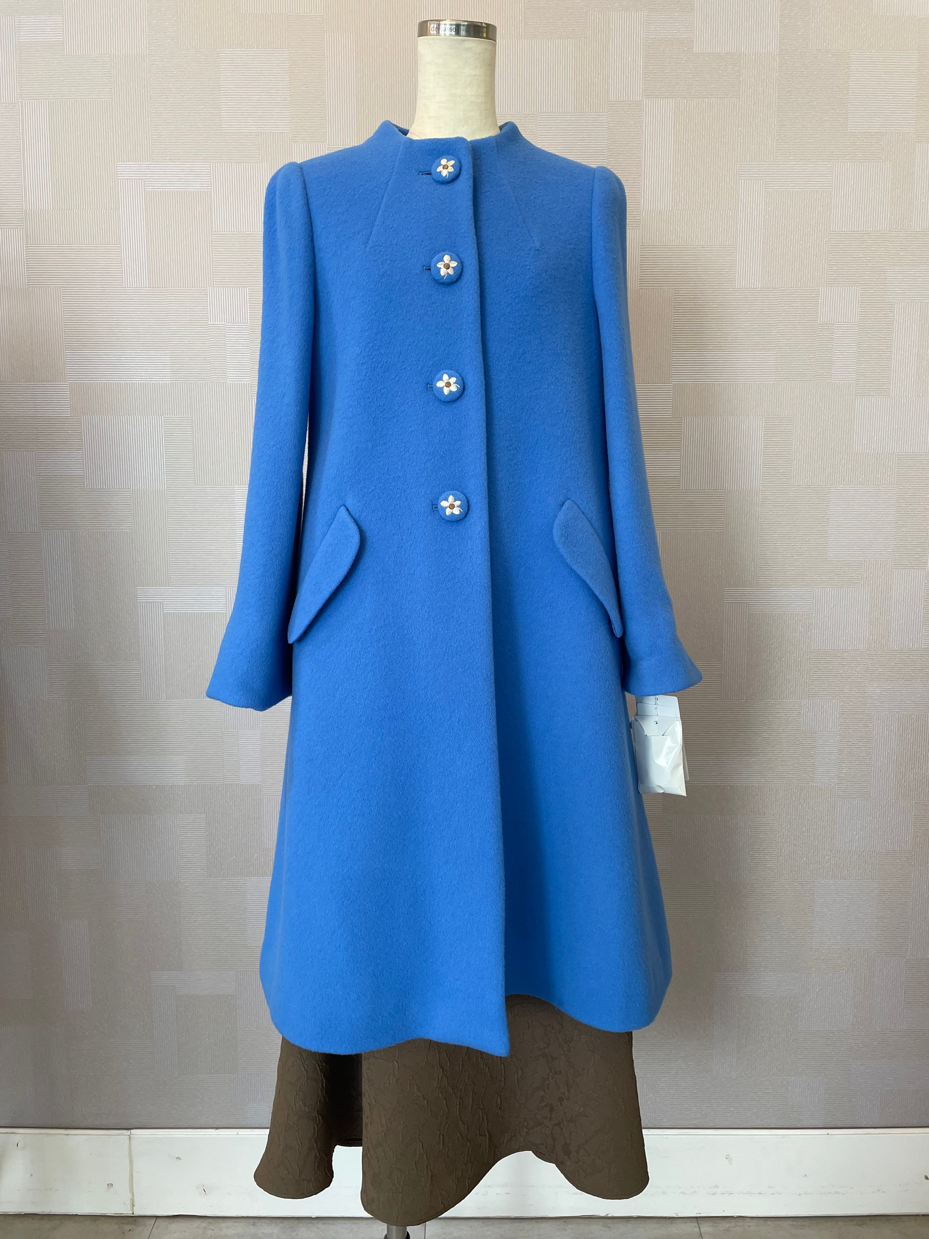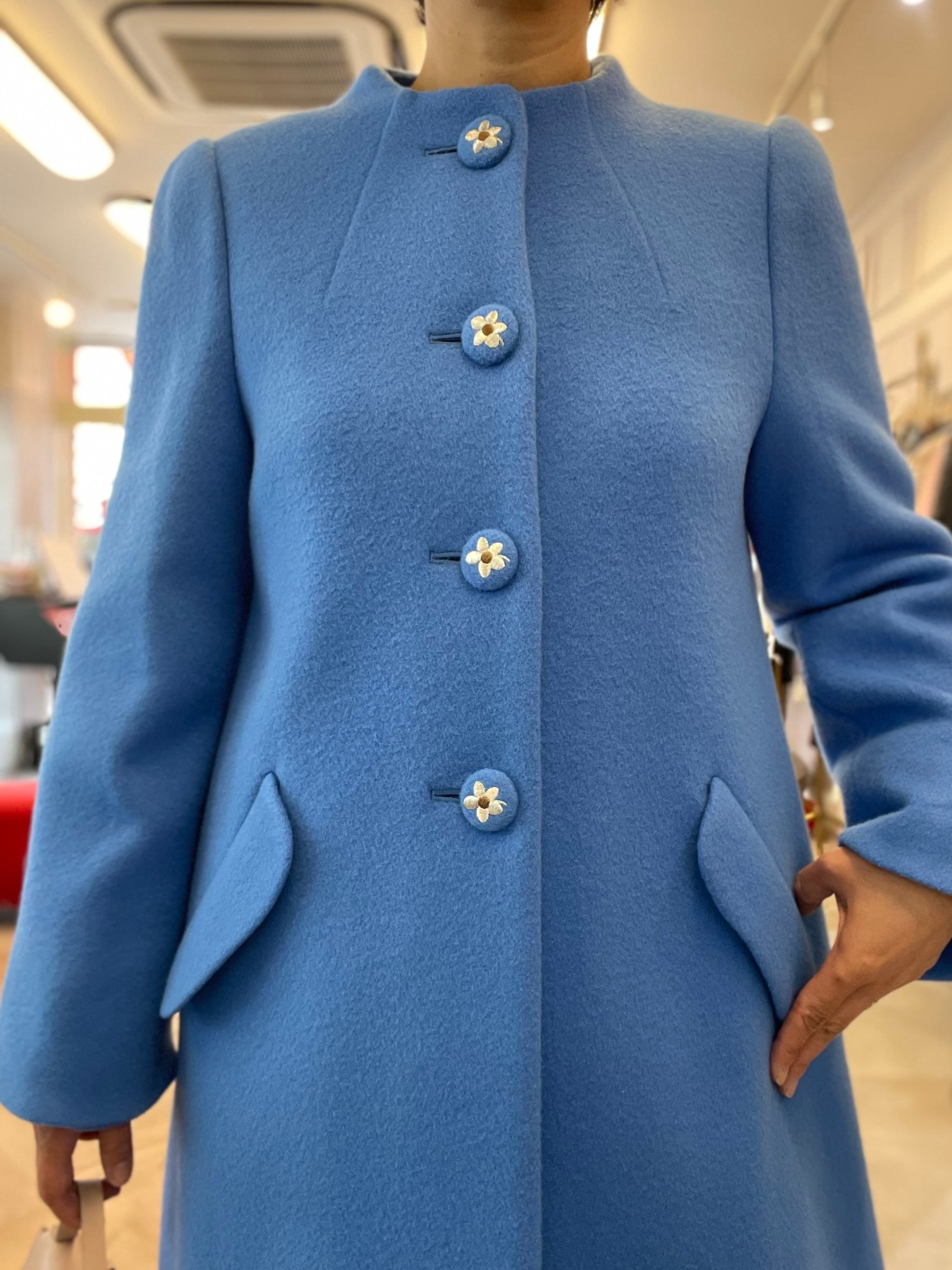 花刺繍ボタン ワンピースコート ウール素材 ブルー